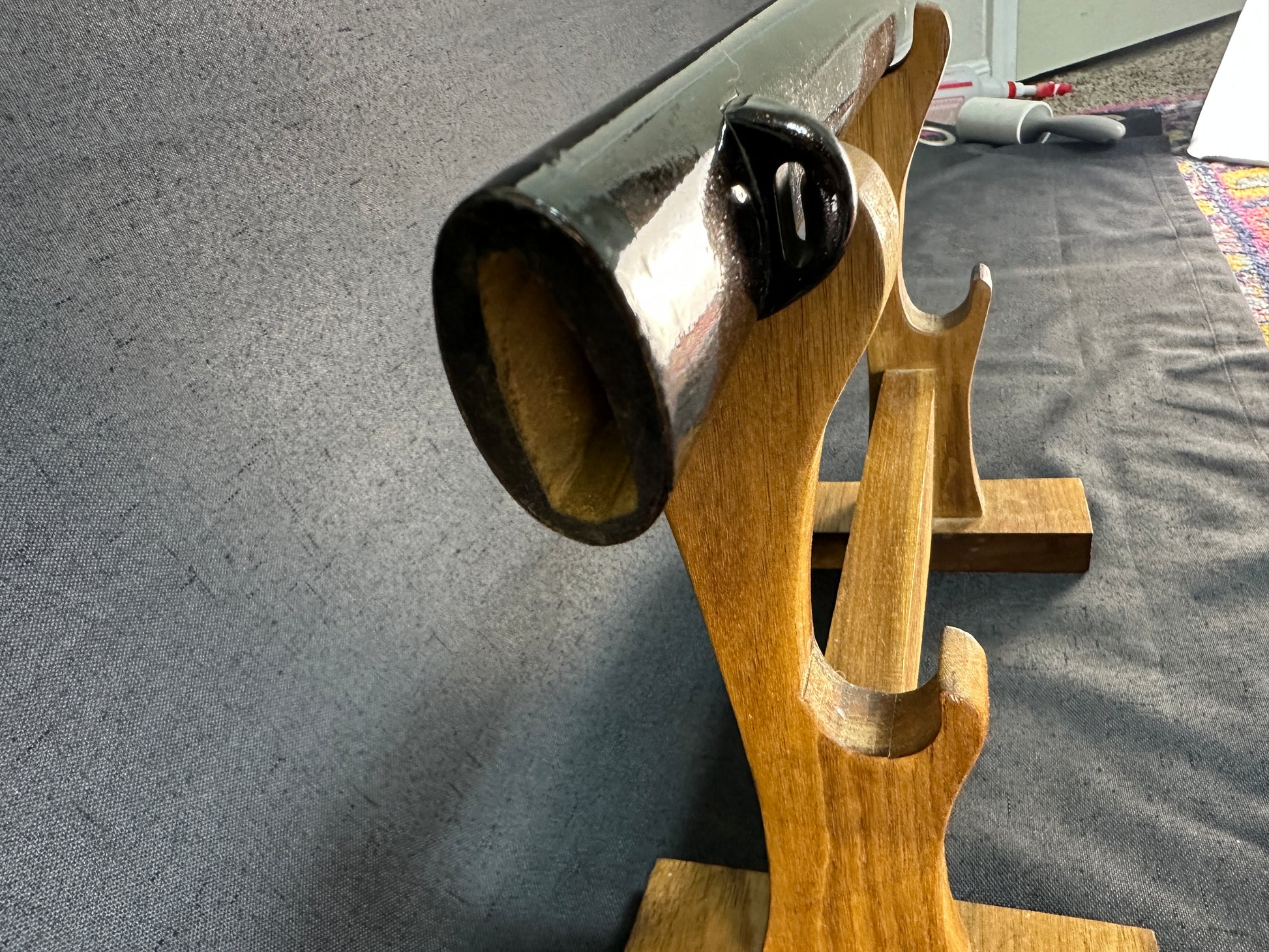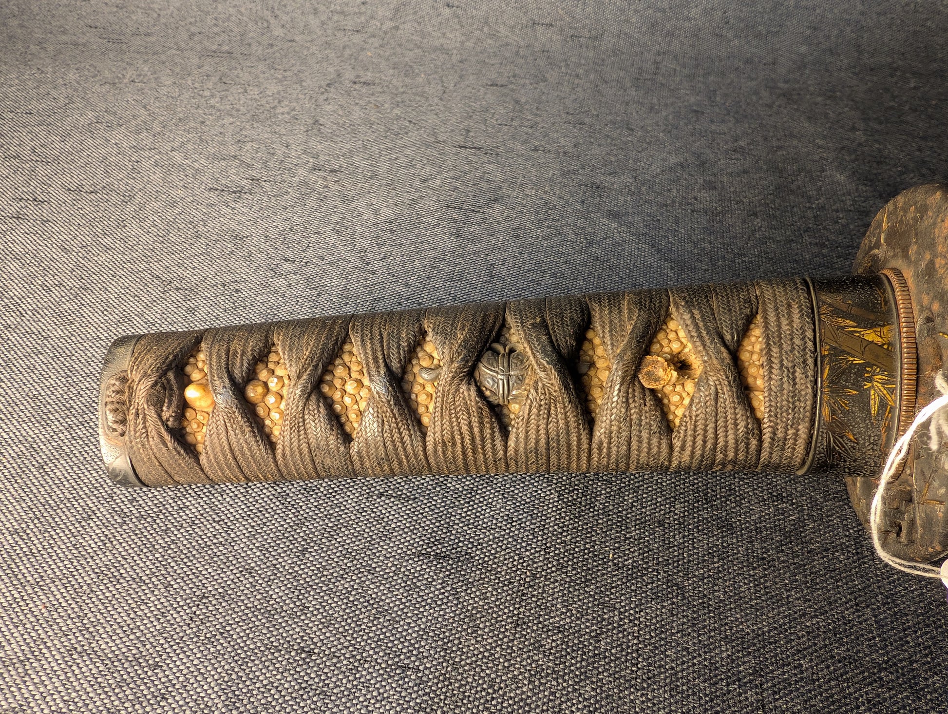 The fuchi and kashira are shakudō with gilt decoration in the form of gilt bamboo leaves and a dimpled stone texture ground, with fine detailing and tasteful restraint. The condition is very good, showing only minor tarnish and small handling wear. The tsuka is wrapped in brown silk ito in tsumami-maki style over high-quality and well-preserved samegawa of yellowed tone, with large nodules. The wrap remains tight and in fantastic condition.
