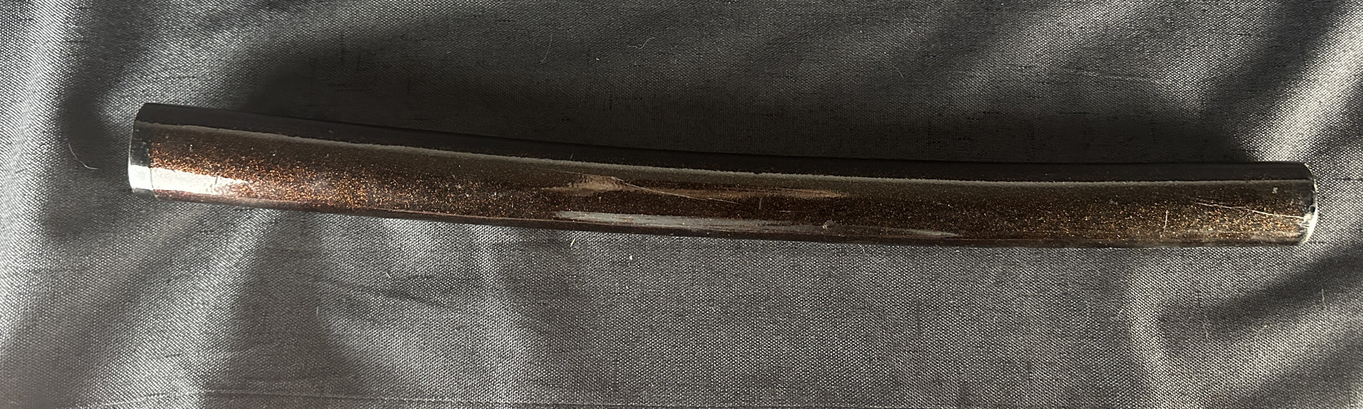 The saya is lacquered in a deep black ro-iro finish, richly sprinkled with fine red-gold powder that gives a subtle shimmering appearance under light. The surface shows light scratches and wear consistent with age, including a few small surface abrasions and one notable scuff on the midsection, but the lacquer retains a strong gloss and solid structure overall. The saya curvature is gentle and well-proportioned.