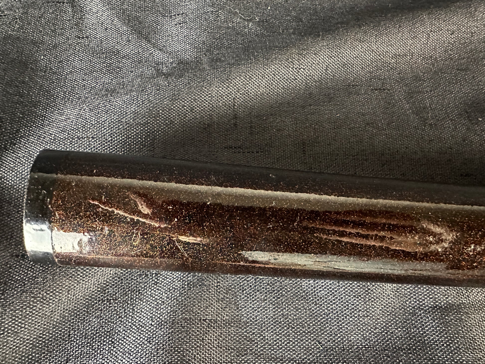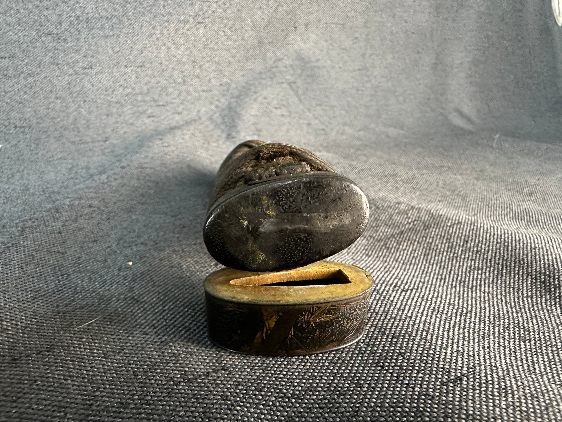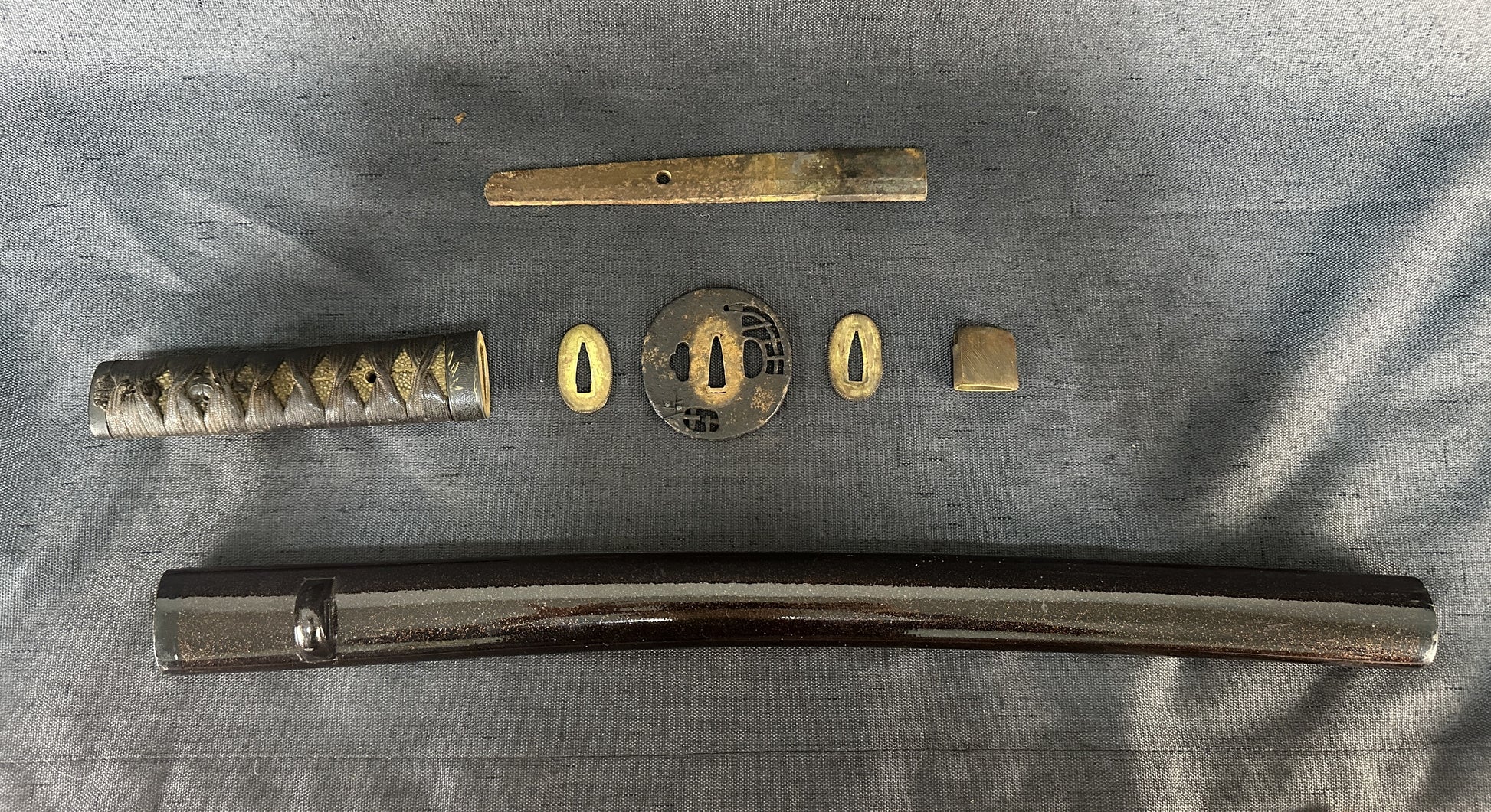Internal notes: This is an attractive late Edo tanto koshirae in complete condition with matching fittings, unified thematically by bamboo and nature motifs. The saya lacquer is particularly appealing under light, with kinpun giving a glittering bronze-gold tone that enhances its display value. The broken blade tang is of little intrinsic value but serves as a faithful remnant of the original mounting’s fit. Restoration would ideally involve the addition of a non-sharpened replacement blade or blade-shaped insert for display purposes. The tsuka, while aged, is tight and displays good craftsmanship. This is a desirable piece for collectors of Edo koshirae, particularly those who appreciate refined lacquerwork and natural-themed fittings. Photos are clear and well-lit, showing the lacquer texture and gilt details effectively.