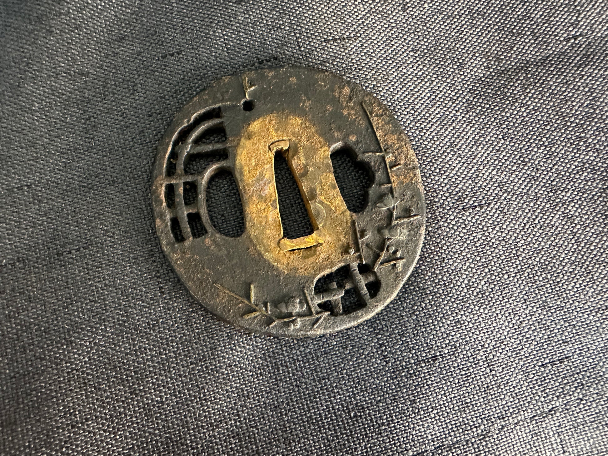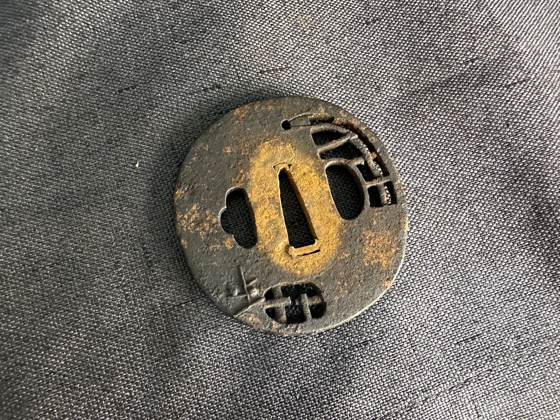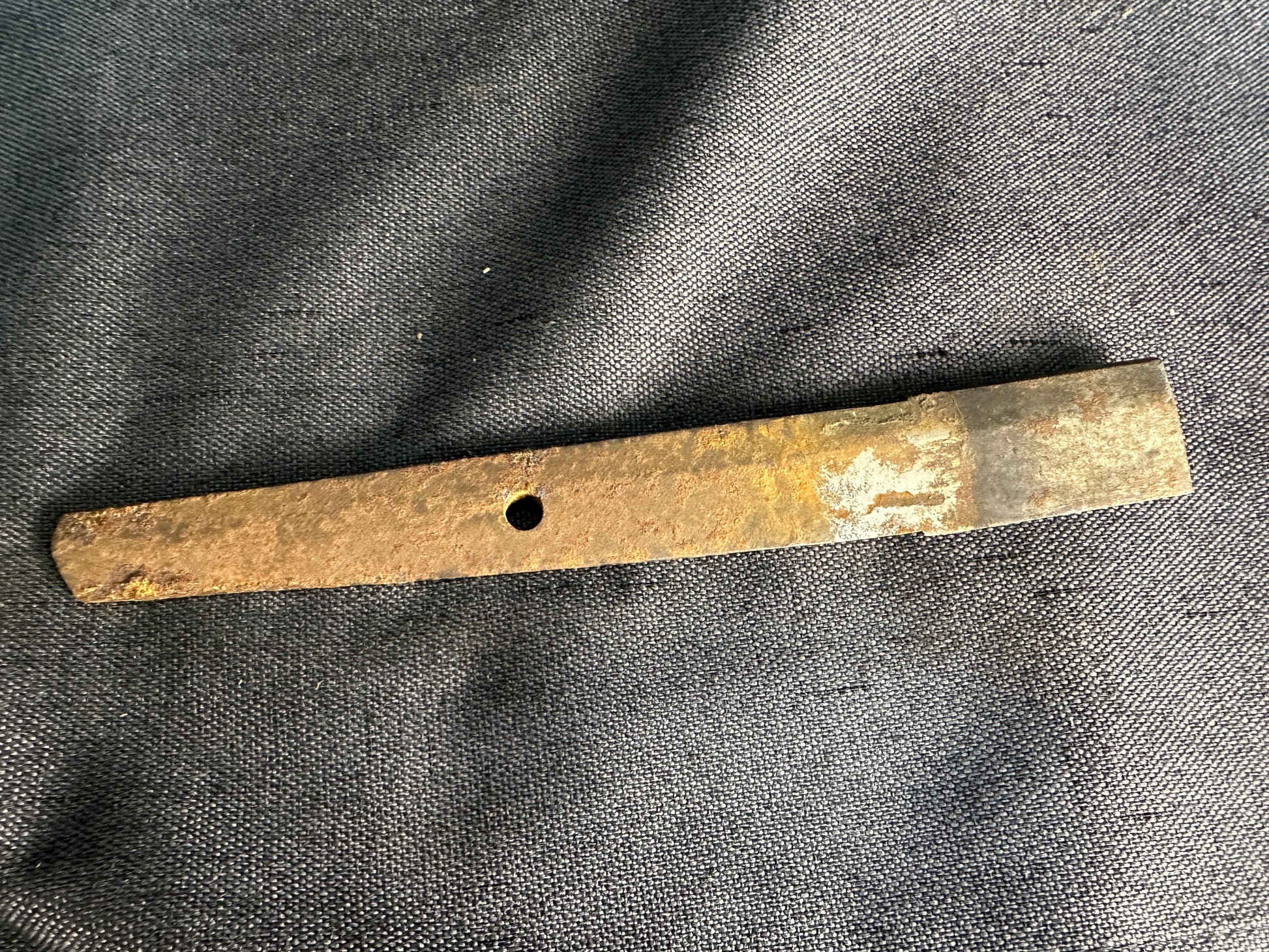 Internal notes: This is an attractive late Edo tanto koshirae in complete condition with matching fittings, unified thematically by bamboo and nature motifs. The saya lacquer is particularly appealing under light, with kinpun giving a glittering bronze-gold tone that enhances its display value. The broken blade tang is of little intrinsic value but serves as a faithful remnant of the original mounting’s fit. Restoration would ideally involve the addition of a non-sharpened replacement blade or blade-shaped insert for display purposes. The tsuka, while aged, is tight and displays good craftsmanship. This is a desirable piece for collectors of Edo koshirae, particularly those who appreciate refined lacquerwork and natural-themed fittings. Photos are clear and well-lit, showing the lacquer texture and gilt details effectively.