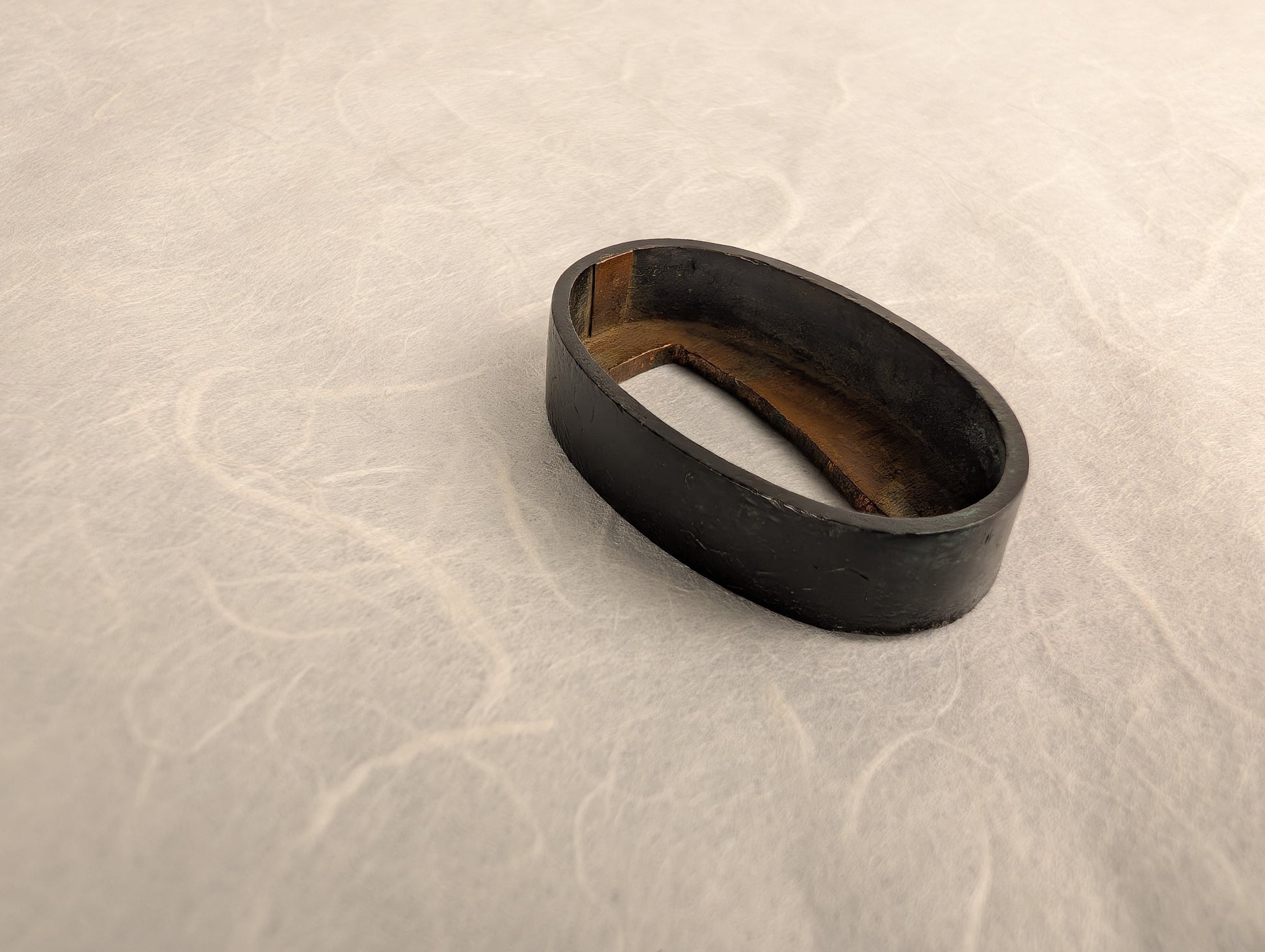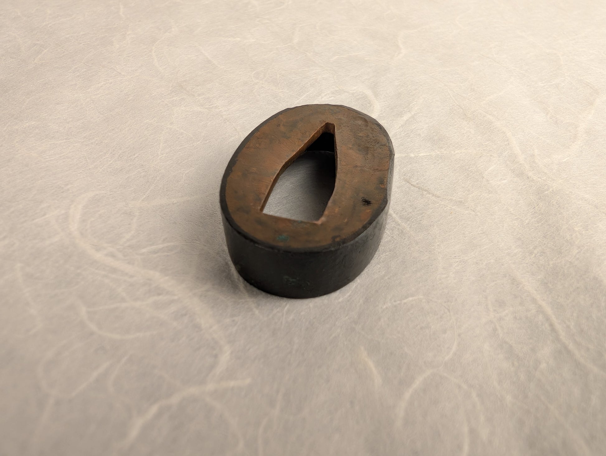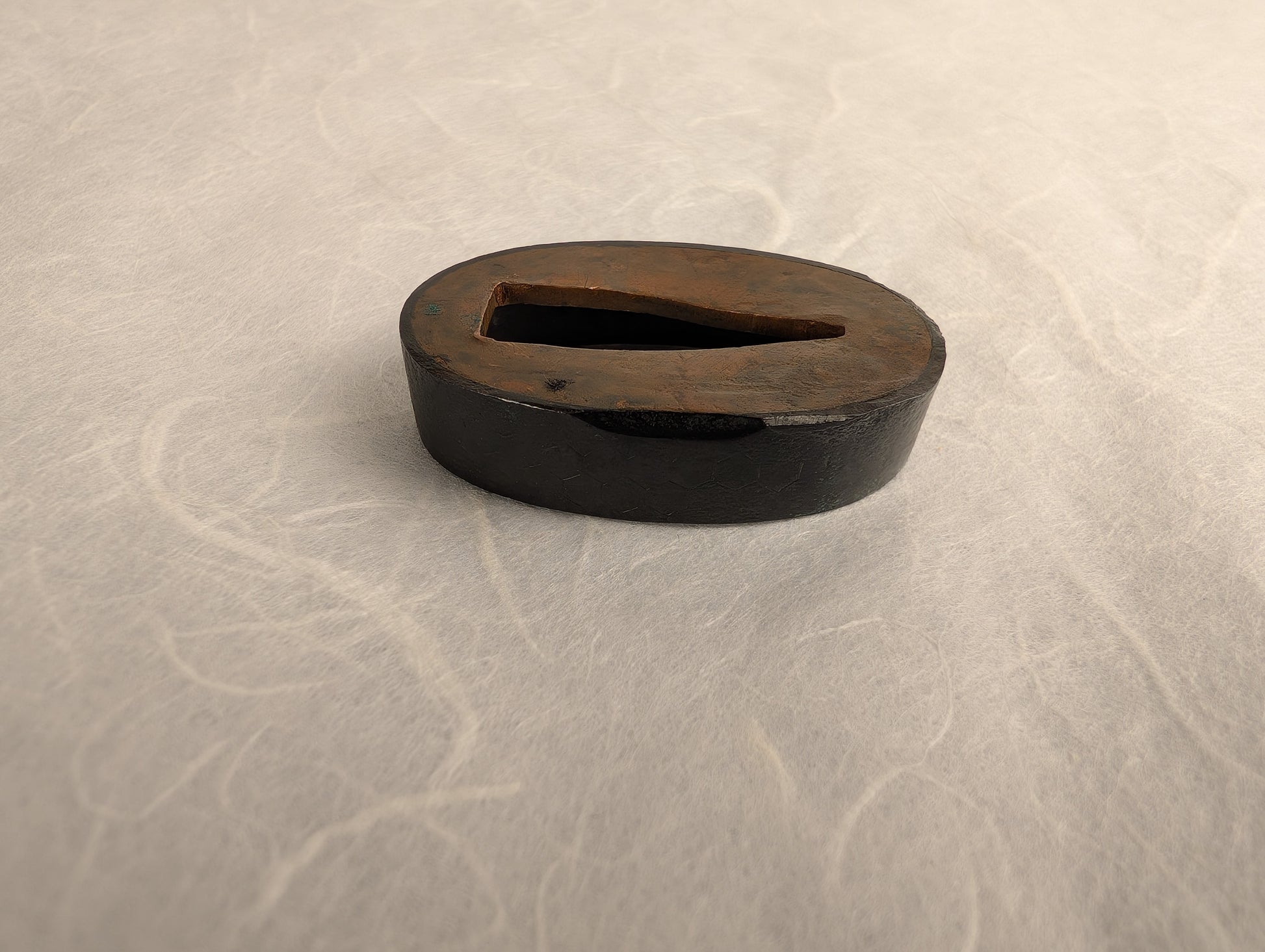 The kikkō pattern was executed through fine chiseling and hammerwork on a shakudo ground, with a deep black patina achieved through traditional rokusho techniques. While age and handling have softened the definition of the hexagons, the evenness of the work and the surviving texture demonstrate careful craftsmanship. Its plain yet dignified character suggests it was intended for understated elegance rather than lavish display.
