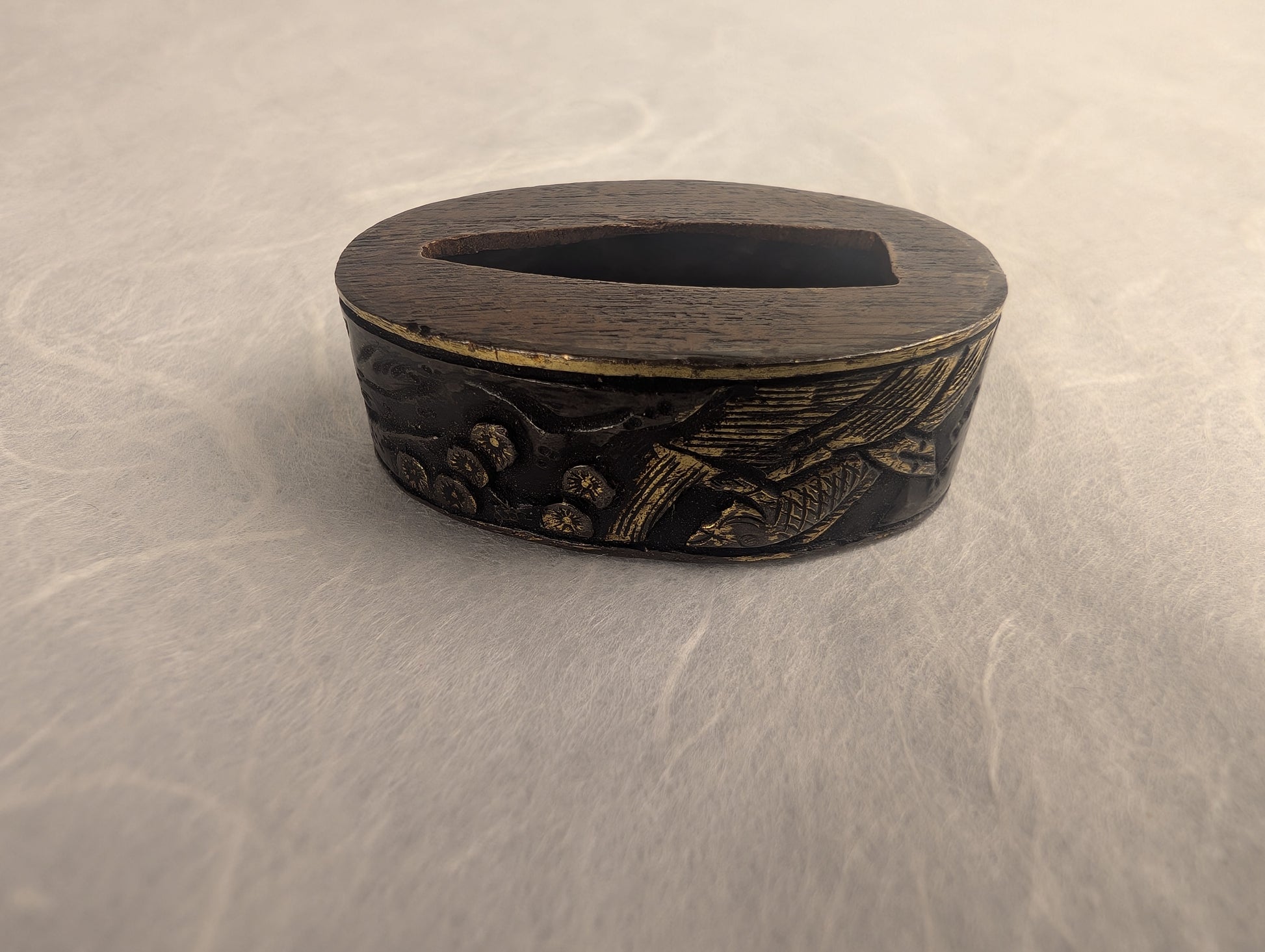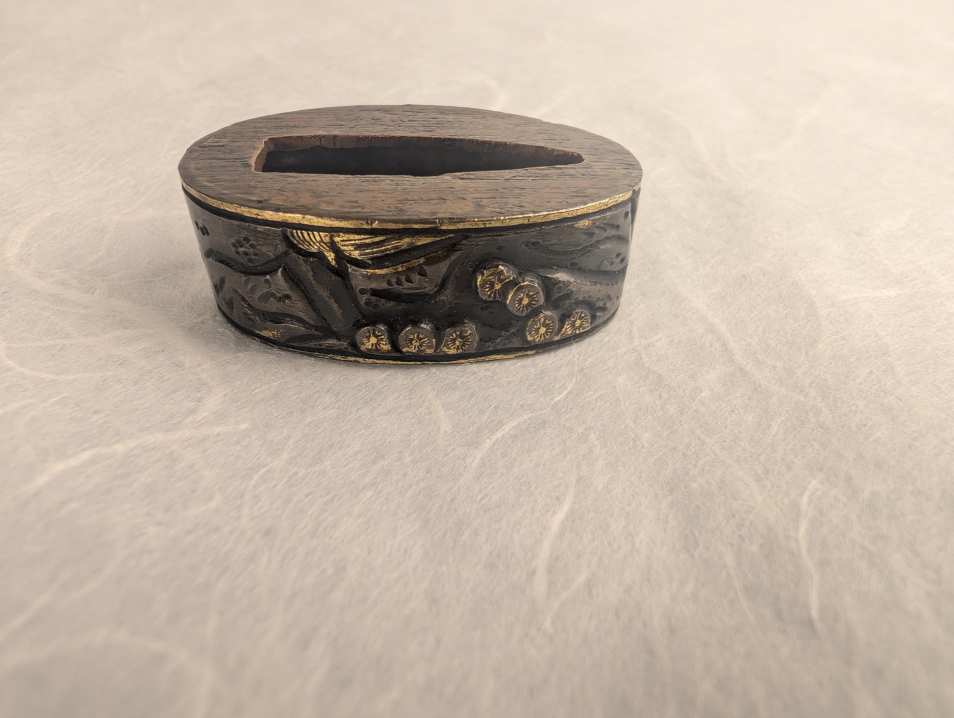 This fuchi is carved with a koi in a stream, overlooking a scene of blossoms and branches. The gilt highlights accentuate the form of the koi and the flowers, for an eye catching piece.