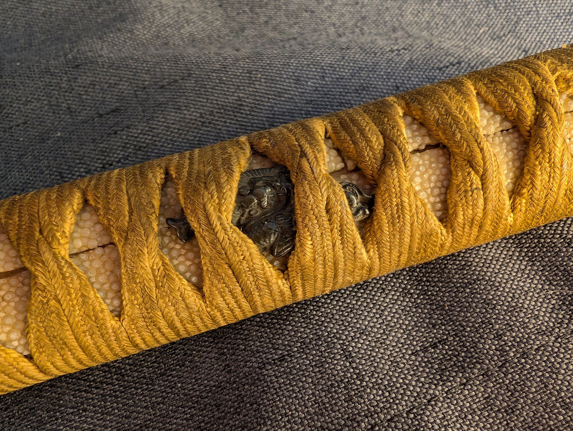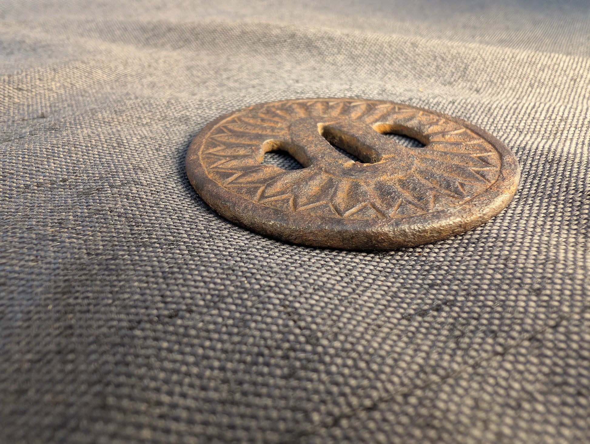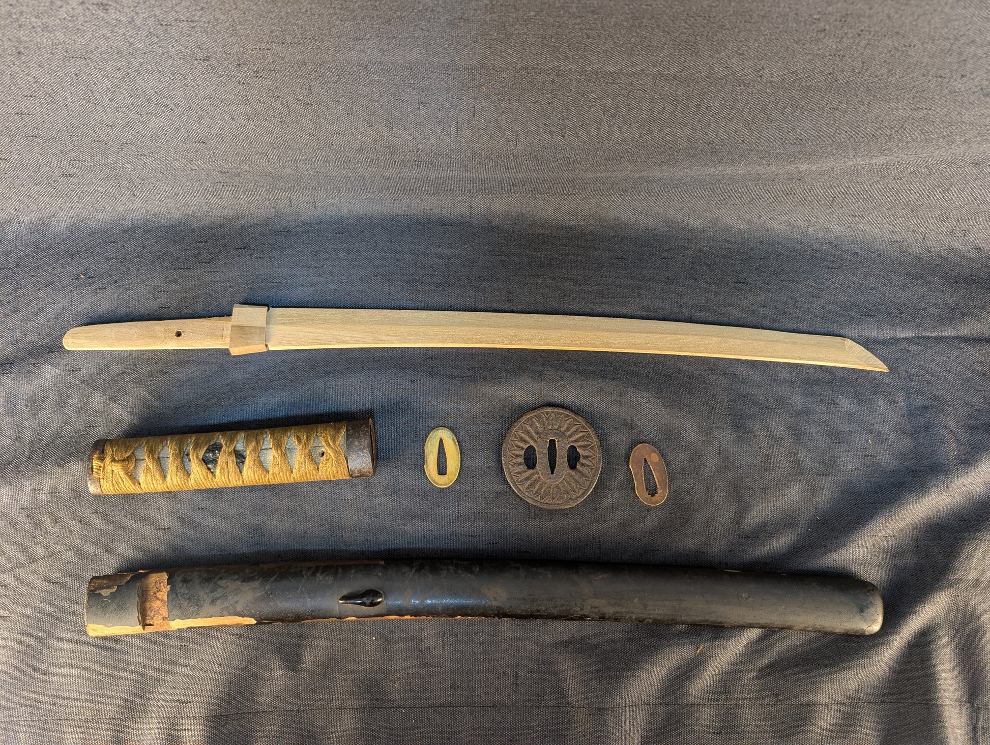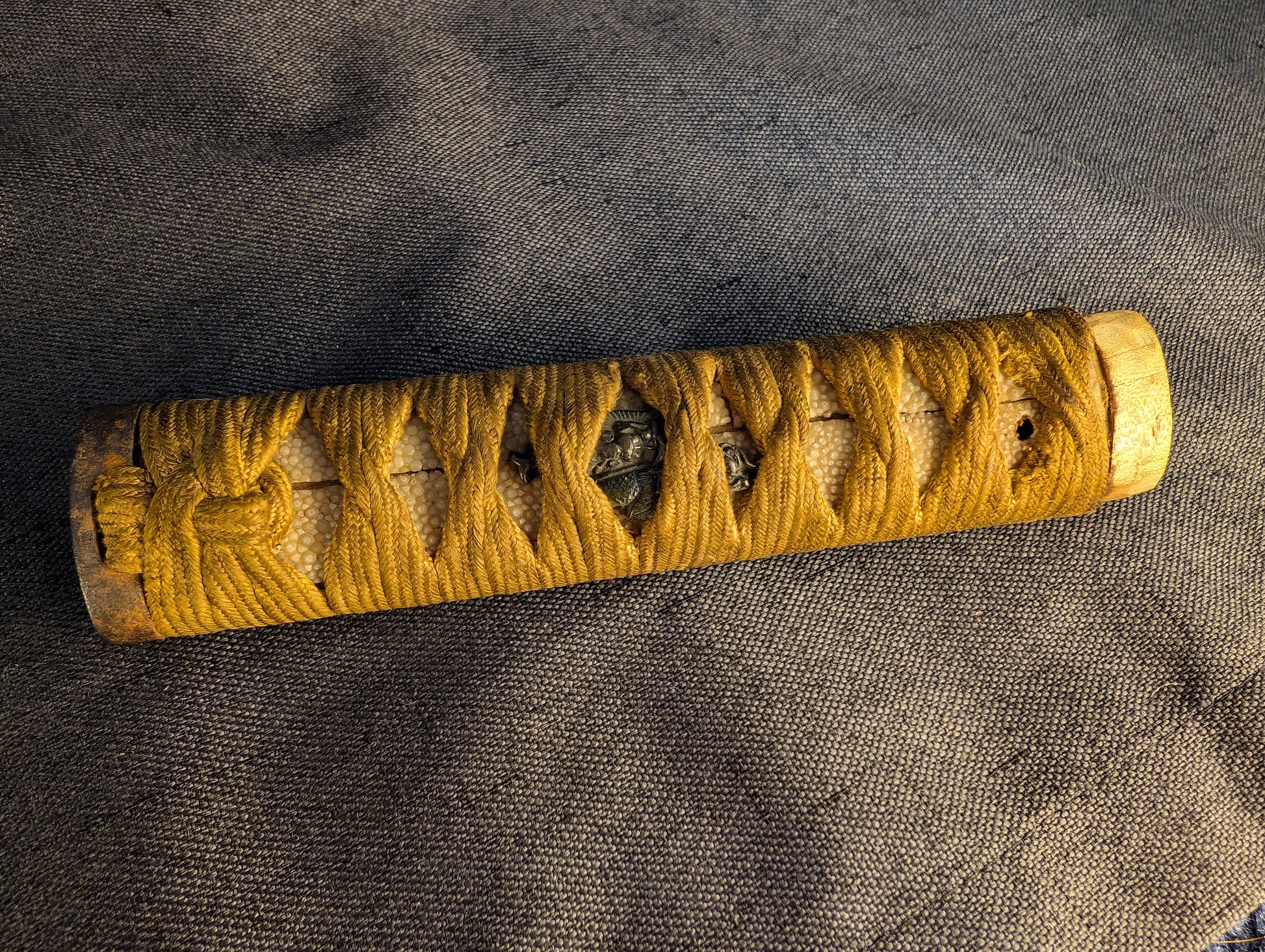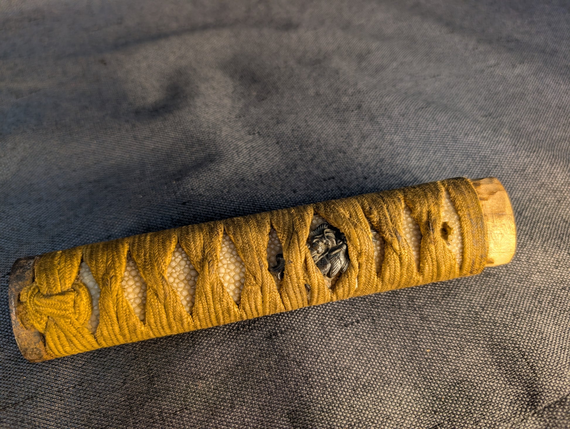 The koshirae fittings are of iron and mixed metal construction. The tsuba, a standout part of the ensemble, is a beautiful circular iron plate carved in low relief with a radiating sunburst pattern extending outward from the nakago-ana, a motif symbolizing clarity and vitality. The surface has a dark, stable patina with minor oxidation in the recesses. The fuchi and kashira are of matching iron with incised scrolling designs, softened with time yet still clear. The kashira shows a simple engraved floral pattern on its face, while the fuchi bears a lively depiction of a rabbit over waves, likely a reference to the hare of Inaba, a classic folktale lionized in wartime Japan. The menuki are of a chocolatey dark copper, their forms difficult to discern under the wrap, appearing to be schools of fish with scaley carved skin leaping over one another. The tsuka is wrapped in golden-brown silk ito in hineri-maki style over paneled samegawa made to appear to be a full wrap with a seam along the ura. The ito is intact but frayed in places, particularly near the mekugi-ana, where the peg hole is visible. The saya (scabbard) is of black lacquer, worn with age, showing areas of loss and small cracks but retaining its original form. Altogether, the fittings harmonize in an earthy and quietly dignified manner, displaying Edo-period craftsmanship without excessive ornamentation, showing a set of fittings that served out its life on a working blade.
