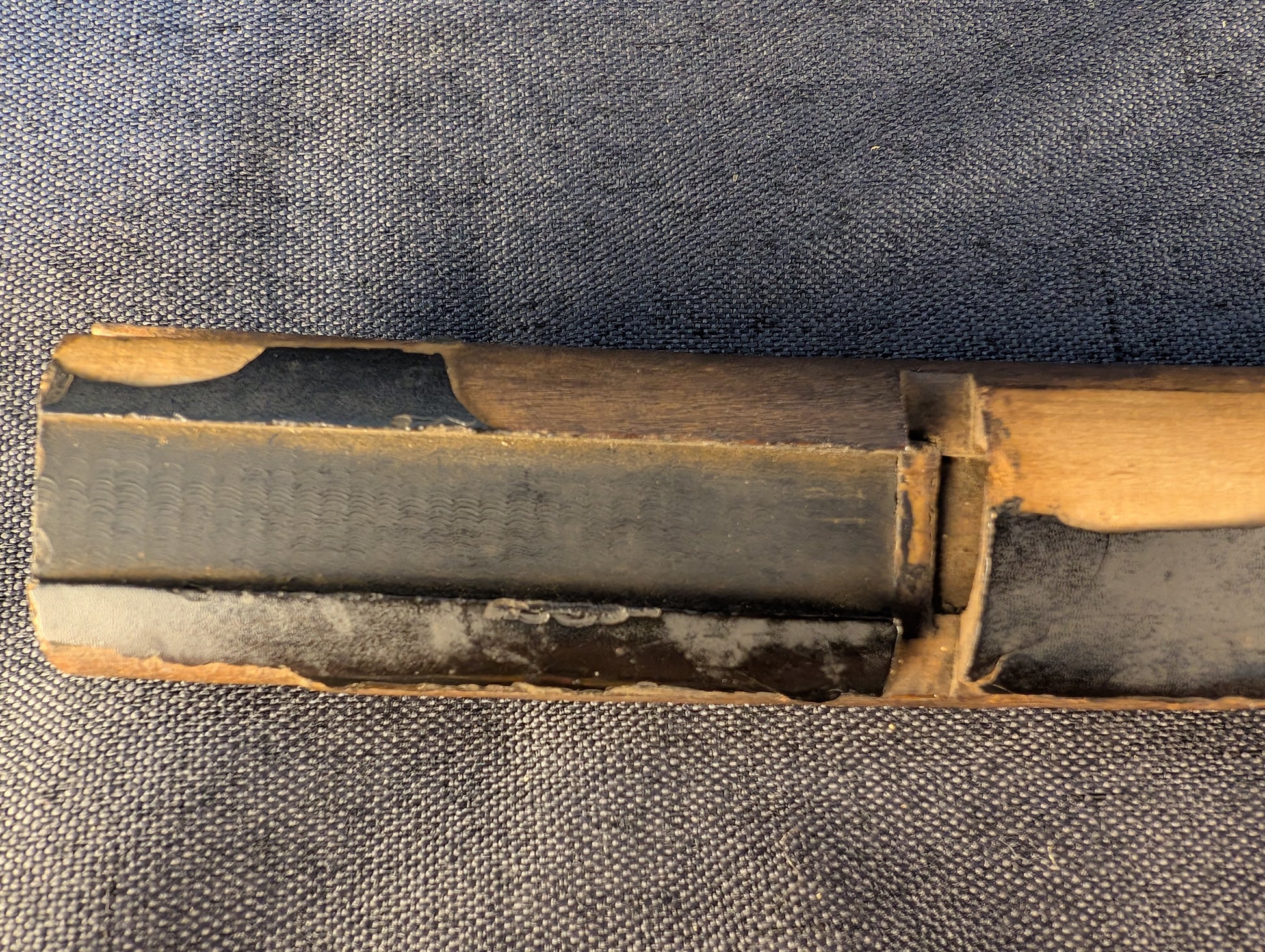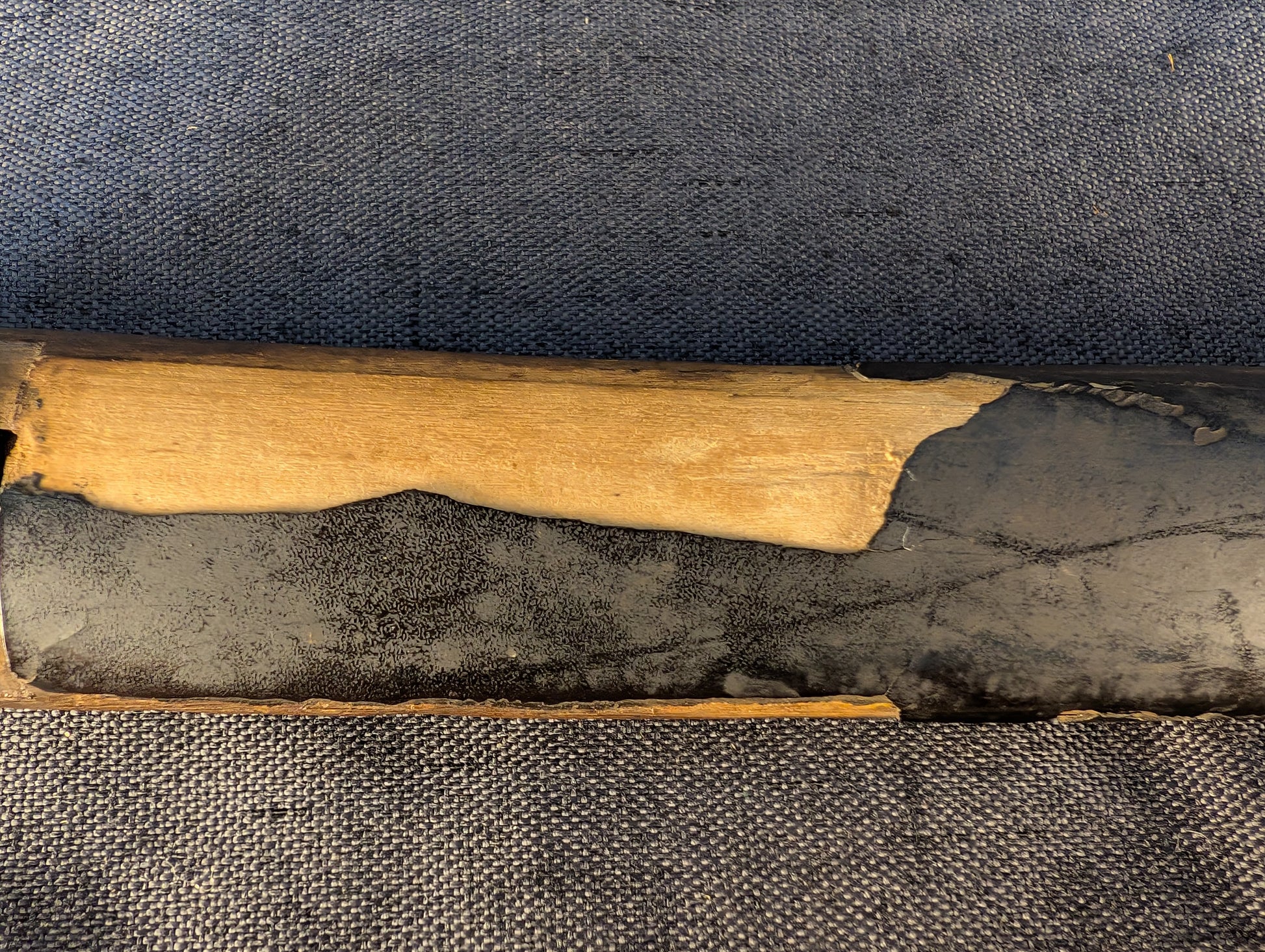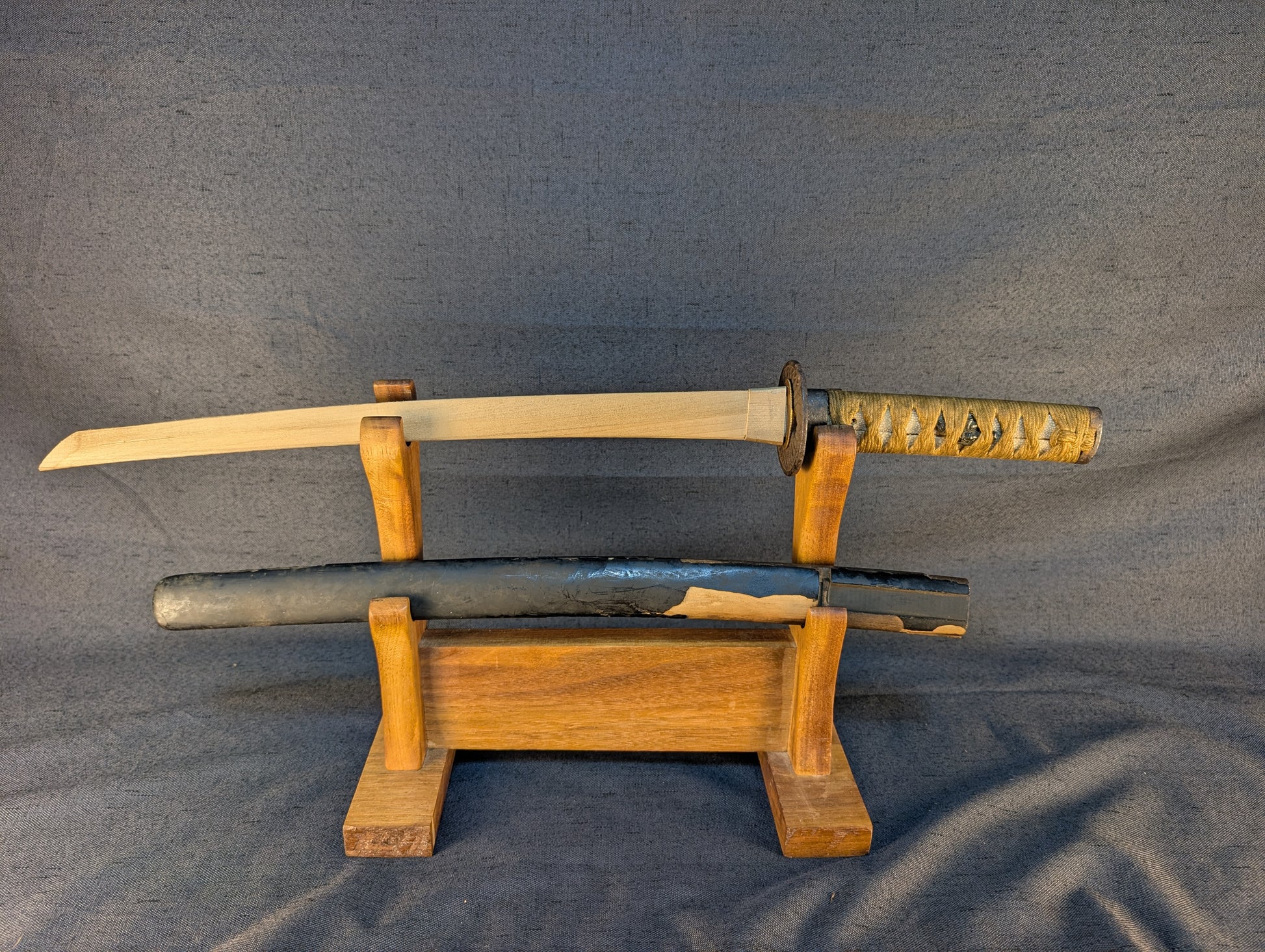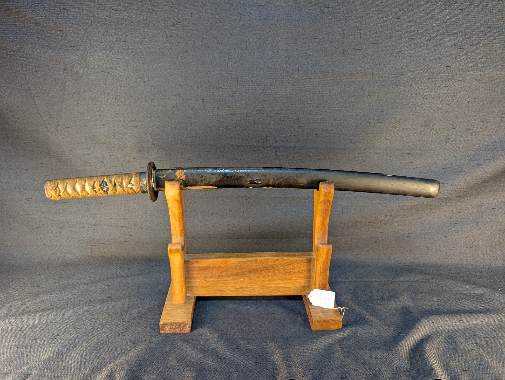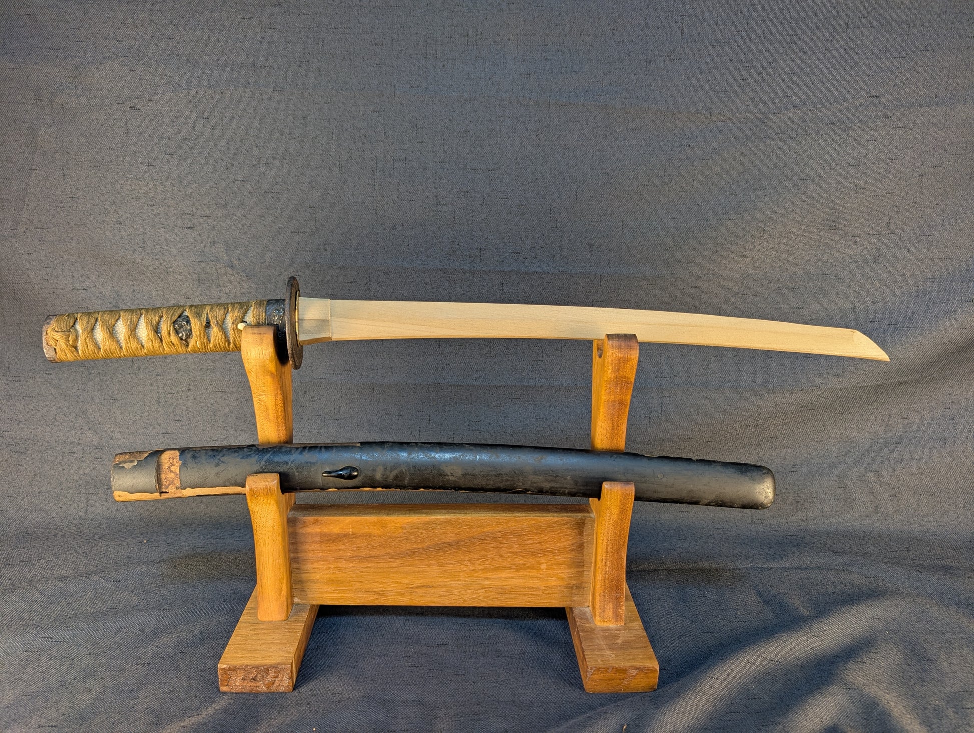 The koshirae fittings are of iron and mixed metal construction. The tsuba, a standout part of the ensemble, is a beautiful circular iron plate carved in low relief with a radiating sunburst pattern extending outward from the nakago-ana, a motif symbolizing clarity and vitality. The surface has a dark, stable patina with minor oxidation in the recesses. The fuchi and kashira are of matching iron with incised scrolling designs, softened with time yet still clear. The kashira shows a simple engraved floral pattern on its face, while the fuchi bears a lively depiction of a rabbit over waves, likely a reference to the hare of Inaba, a classic folktale lionized in wartime Japan. The menuki are of a chocolatey dark copper, their forms difficult to discern under the wrap, appearing to be schools of fish with scaley carved skin leaping over one another. The tsuka is wrapped in golden-brown silk ito in hineri-maki style over paneled samegawa made to appear to be a full wrap with a seam along the ura. The ito is intact but frayed in places, particularly near the mekugi-ana, where the peg hole is visible. The saya (scabbard) is of black lacquer, worn with age, showing areas of loss and small cracks but retaining its original form. Altogether, the fittings harmonize in an earthy and quietly dignified manner, displaying Edo-period craftsmanship without excessive ornamentation, showing a set of fittings that served out its life on a working blade.