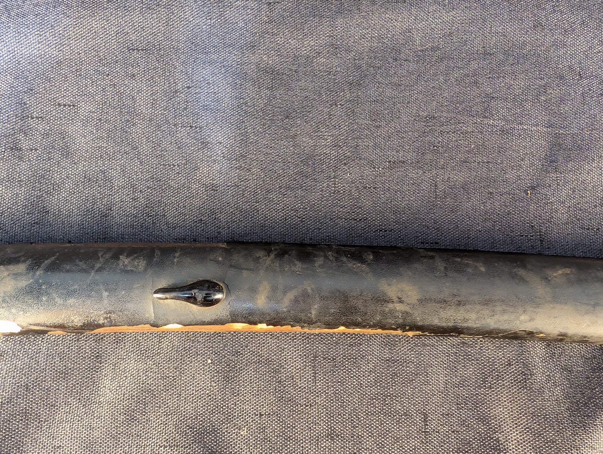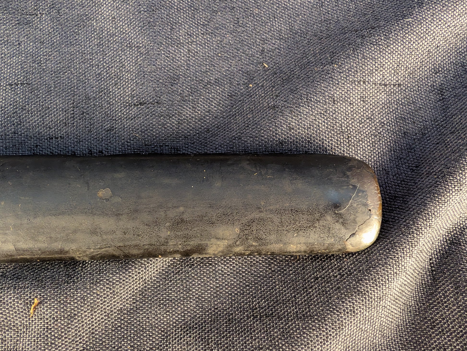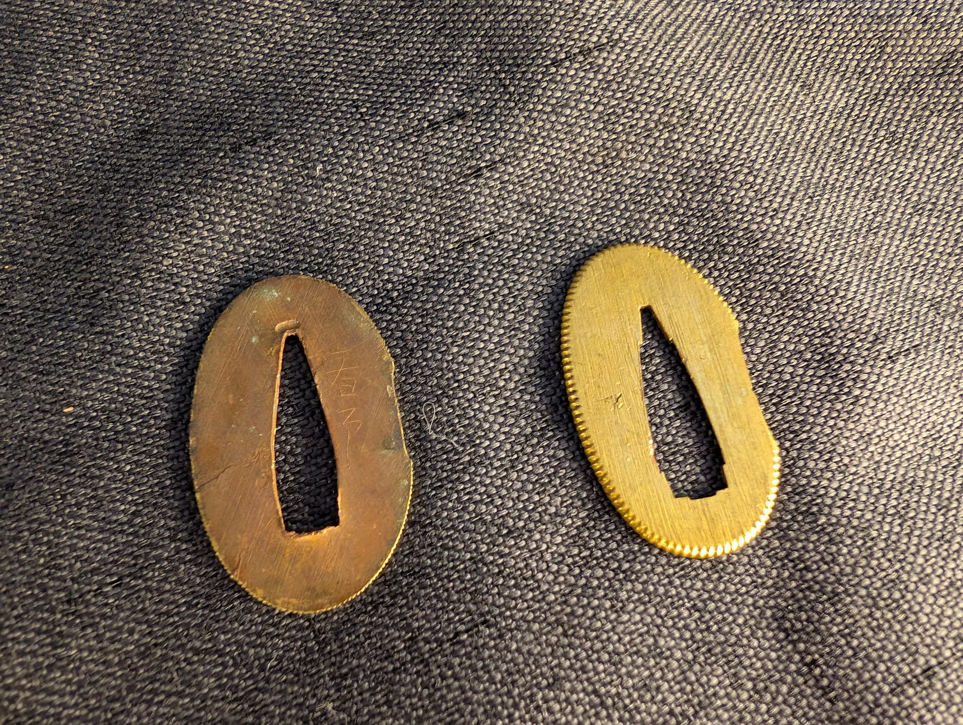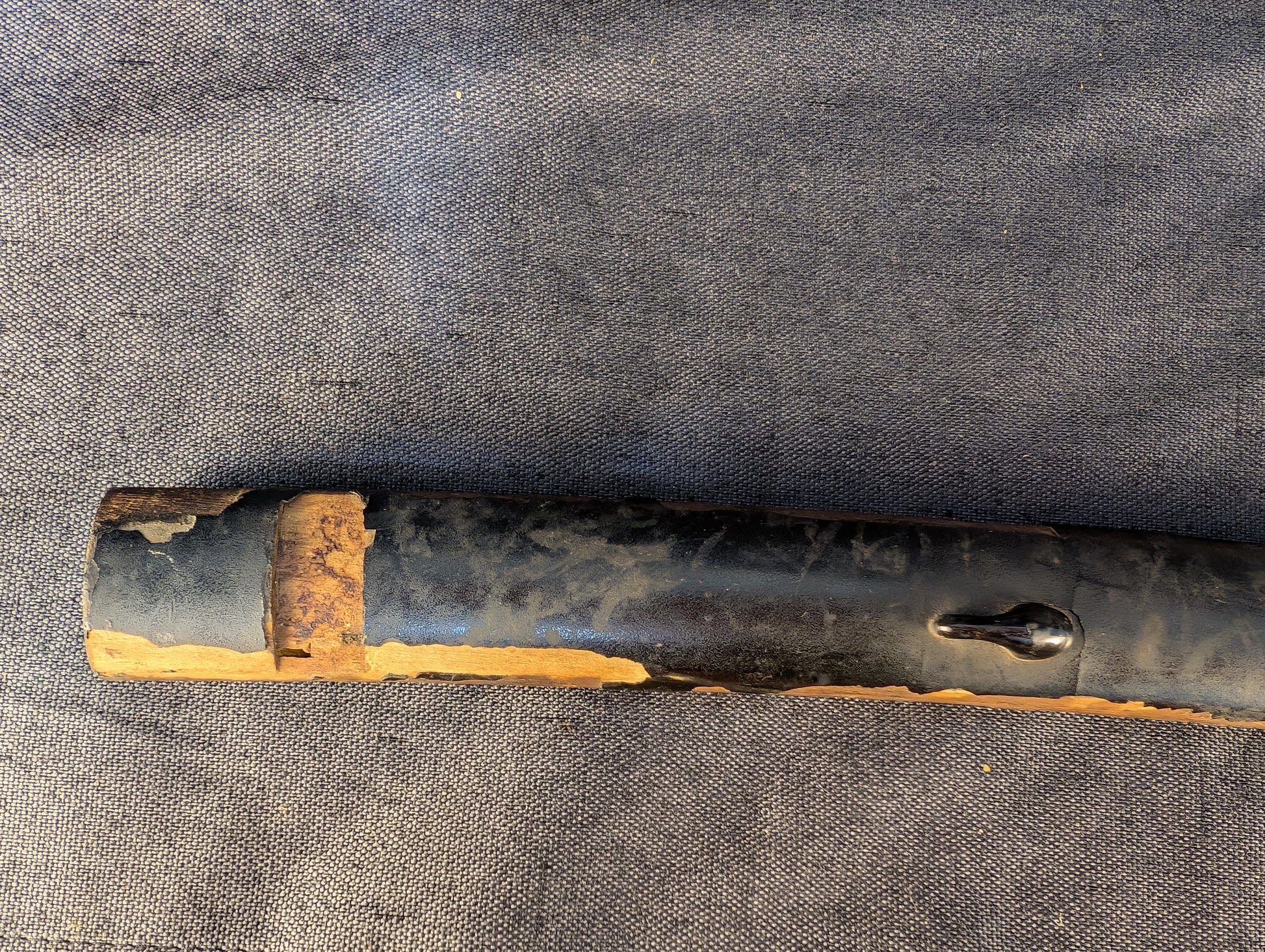 The koshirae fittings are of iron and mixed metal construction. The tsuba, a standout part of the ensemble, is a beautiful circular iron plate carved in low relief with a radiating sunburst pattern extending outward from the nakago-ana, a motif symbolizing clarity and vitality. The surface has a dark, stable patina with minor oxidation in the recesses. The fuchi and kashira are of matching iron with incised scrolling designs, softened with time yet still clear. The kashira shows a simple engraved floral pattern on its face, while the fuchi bears a lively depiction of a rabbit over waves, likely a reference to the hare of Inaba, a classic folktale lionized in wartime Japan. The menuki are of a chocolatey dark copper, their forms difficult to discern under the wrap, appearing to be schools of fish with scaley carved skin leaping over one another. The tsuka is wrapped in golden-brown silk ito in hineri-maki style over paneled samegawa made to appear to be a full wrap with a seam along the ura. The ito is intact but frayed in places, particularly near the mekugi-ana, where the peg hole is visible. The saya (scabbard) is of black lacquer, worn with age, showing areas of loss and small cracks but retaining its original form. Altogether, the fittings harmonize in an earthy and quietly dignified manner, displaying Edo-period craftsmanship without excessive ornamentation, showing a set of fittings that served out its life on a working blade.