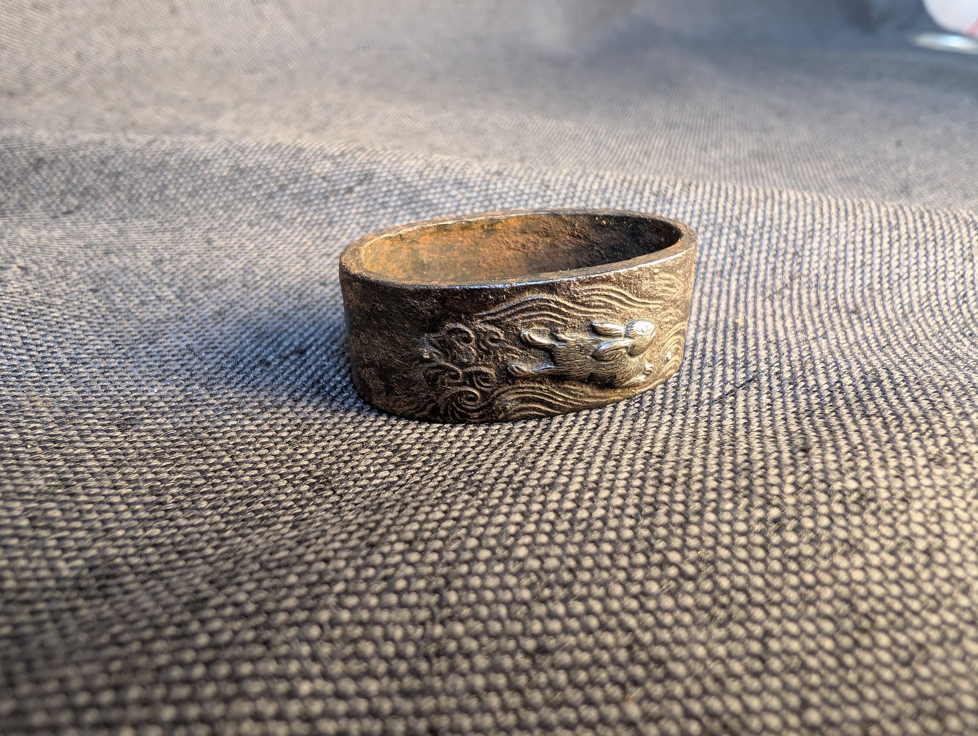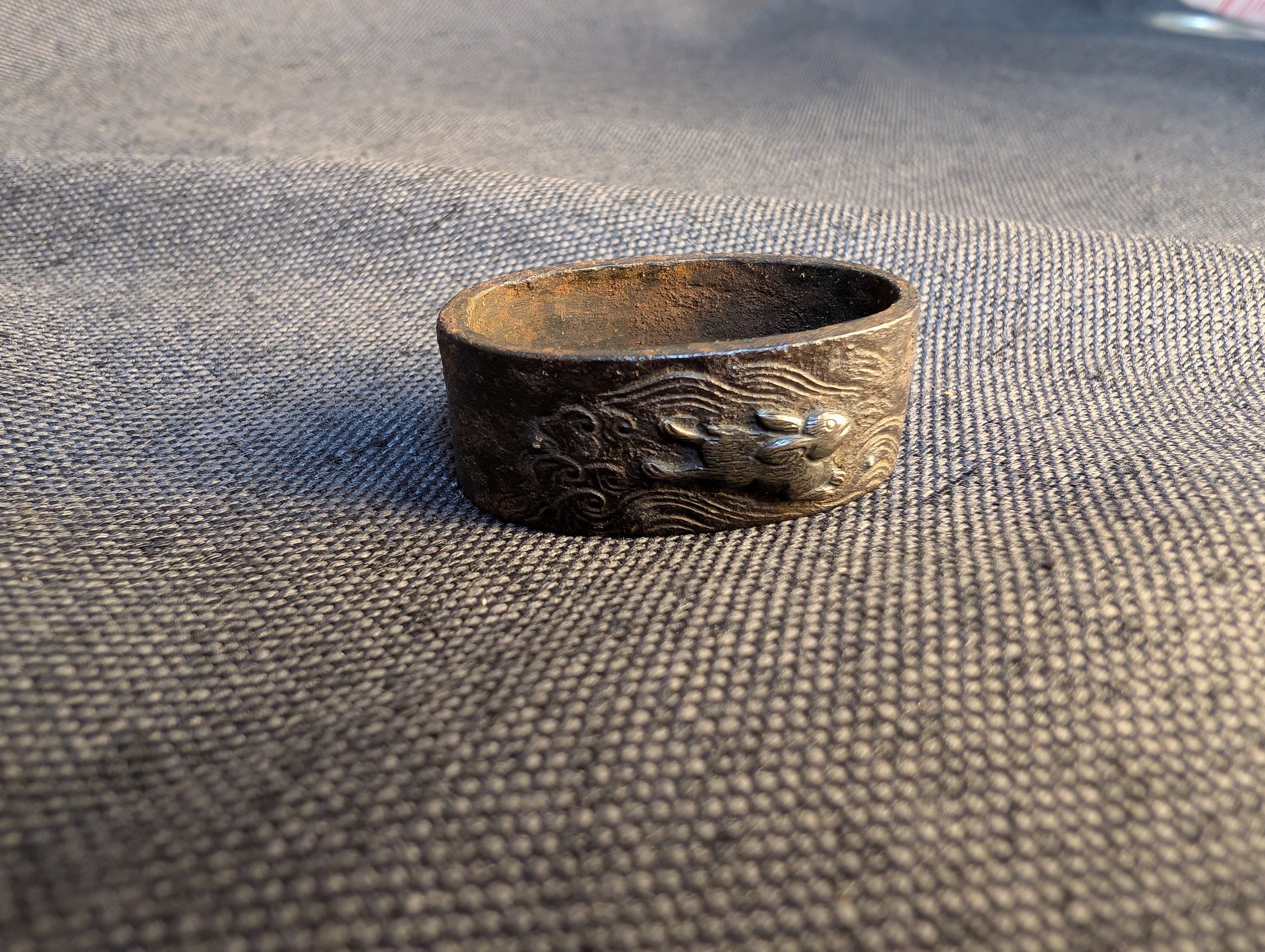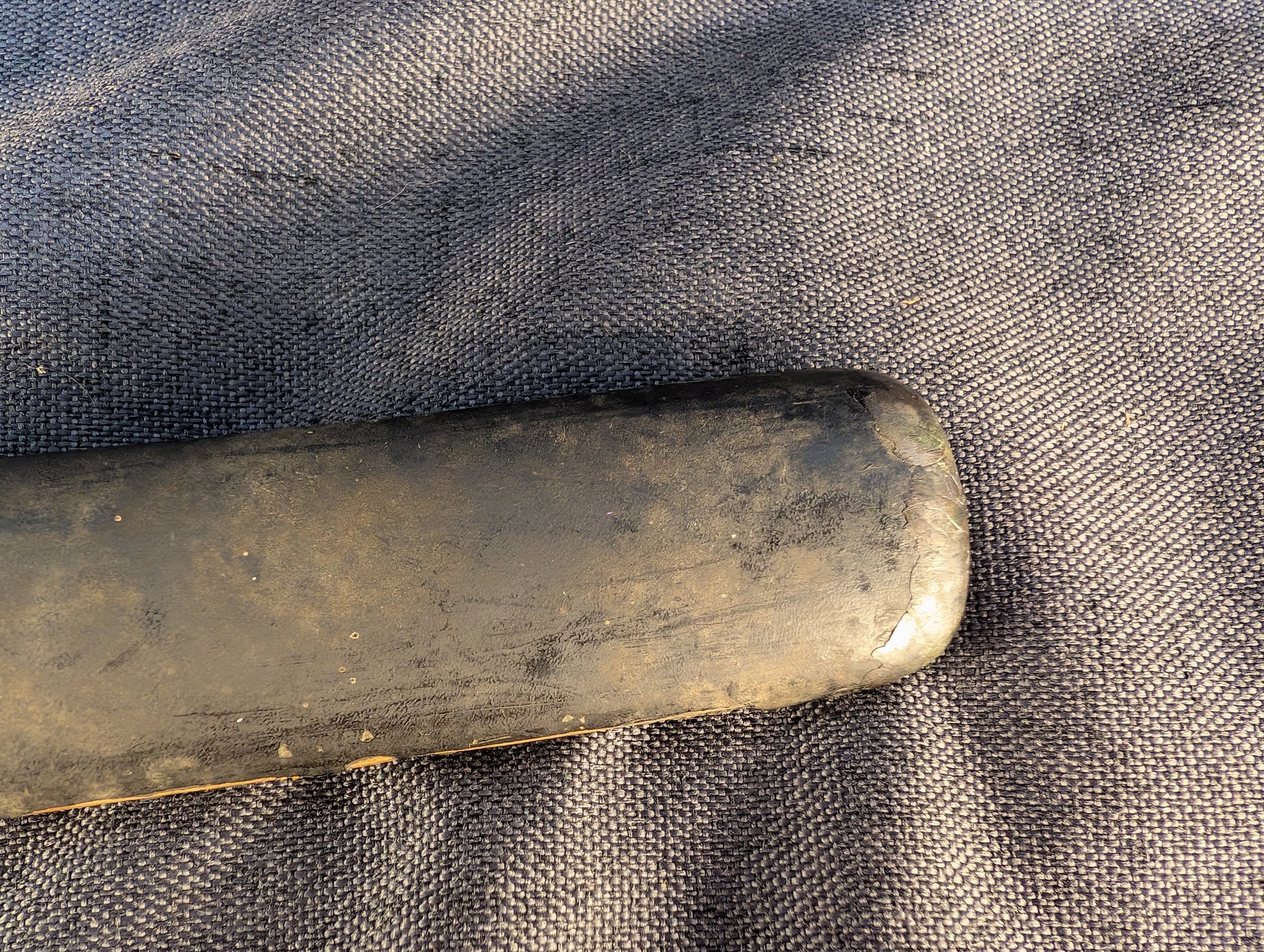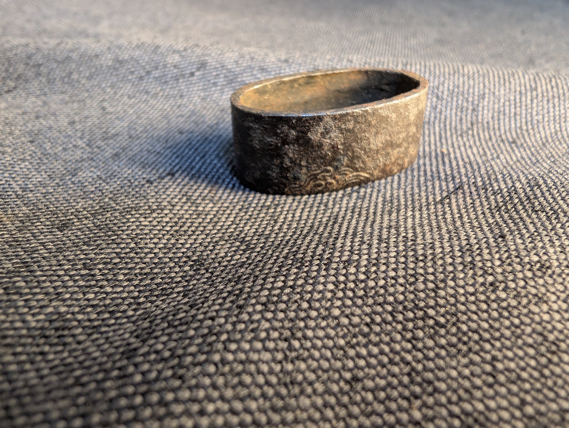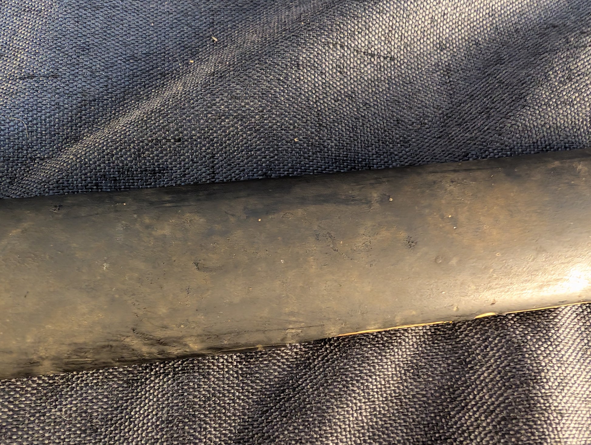 The koshirae fittings are of iron and mixed metal construction. The tsuba, a standout part of the ensemble, is a beautiful circular iron plate carved in low relief with a radiating sunburst pattern extending outward from the nakago-ana, a motif symbolizing clarity and vitality. The surface has a dark, stable patina with minor oxidation in the recesses. The fuchi and kashira are of matching iron with incised scrolling designs, softened with time yet still clear. The kashira shows a simple engraved floral pattern on its face, while the fuchi bears a lively depiction of a rabbit over waves, likely a reference to the hare of Inaba, a classic folktale lionized in wartime Japan. The menuki are of a chocolatey dark copper, their forms difficult to discern under the wrap, appearing to be schools of fish with scaley carved skin leaping over one another. The tsuka is wrapped in golden-brown silk ito in hineri-maki style over paneled samegawa made to appear to be a full wrap with a seam along the ura. The ito is intact but frayed in places, particularly near the mekugi-ana, where the peg hole is visible. The saya (scabbard) is of black lacquer, worn with age, showing areas of loss and small cracks but retaining its original form. Altogether, the fittings harmonize in an earthy and quietly dignified manner, displaying Edo-period craftsmanship without excessive ornamentation, showing a set of fittings that served out its life on a working blade.