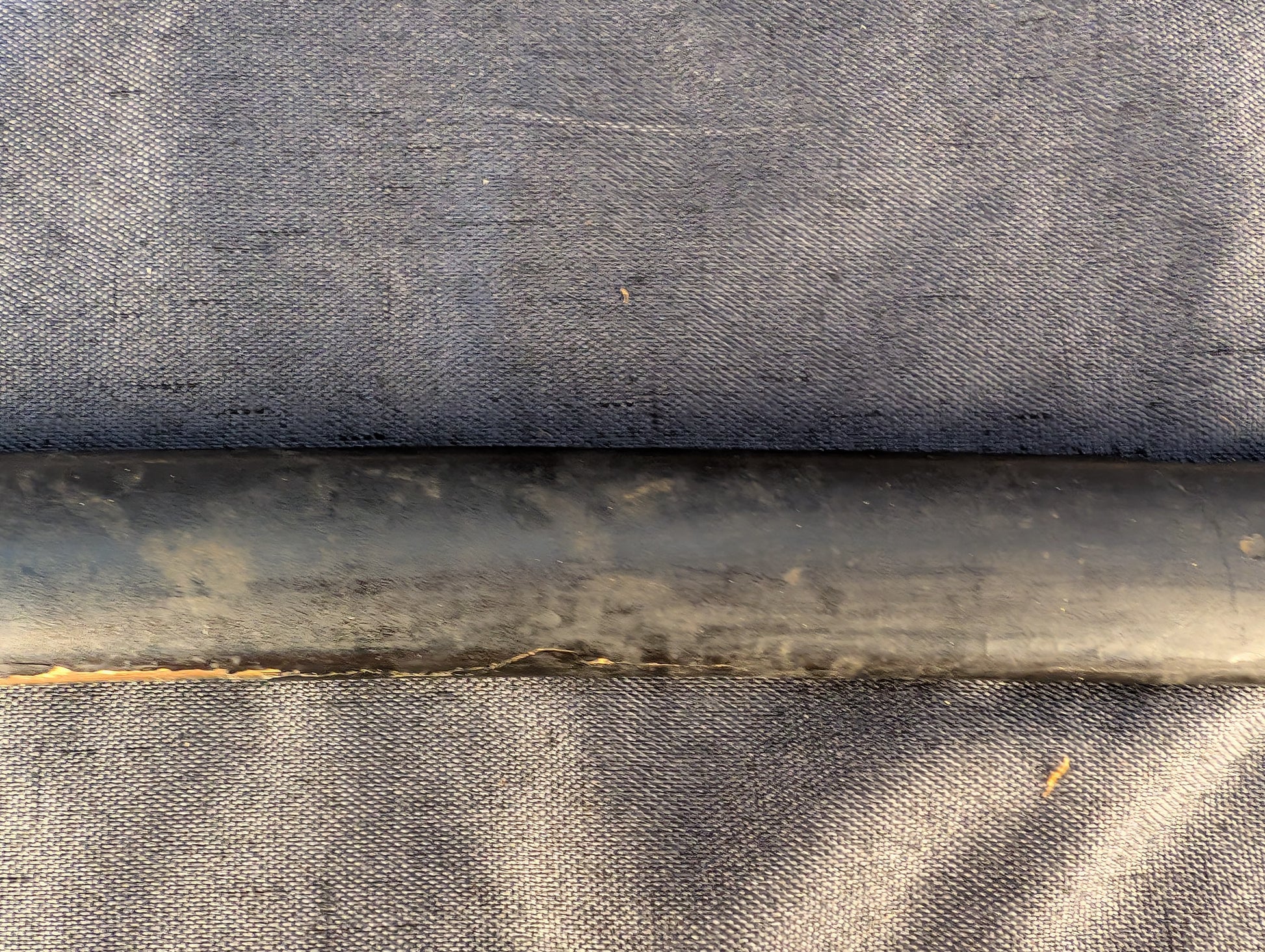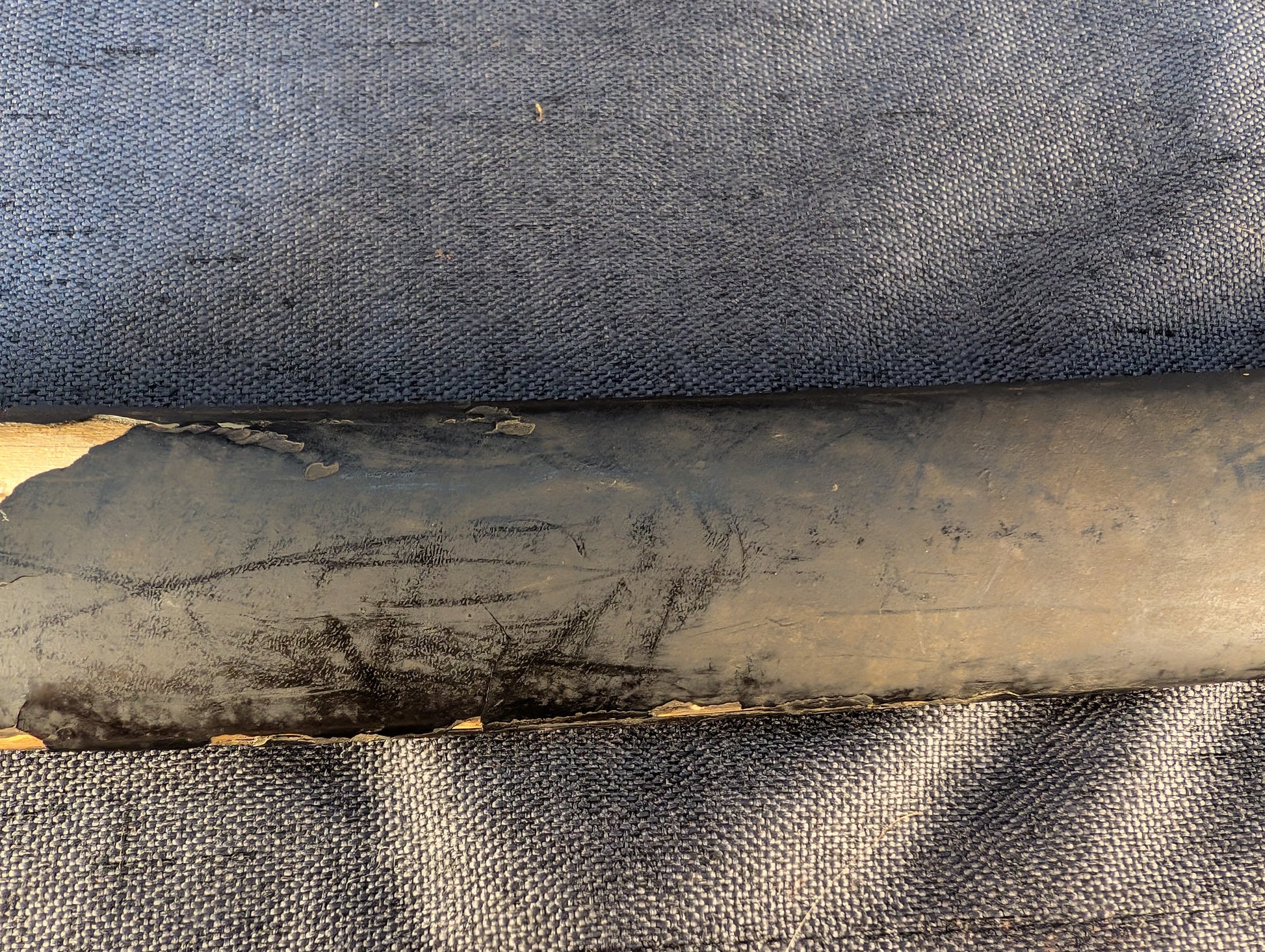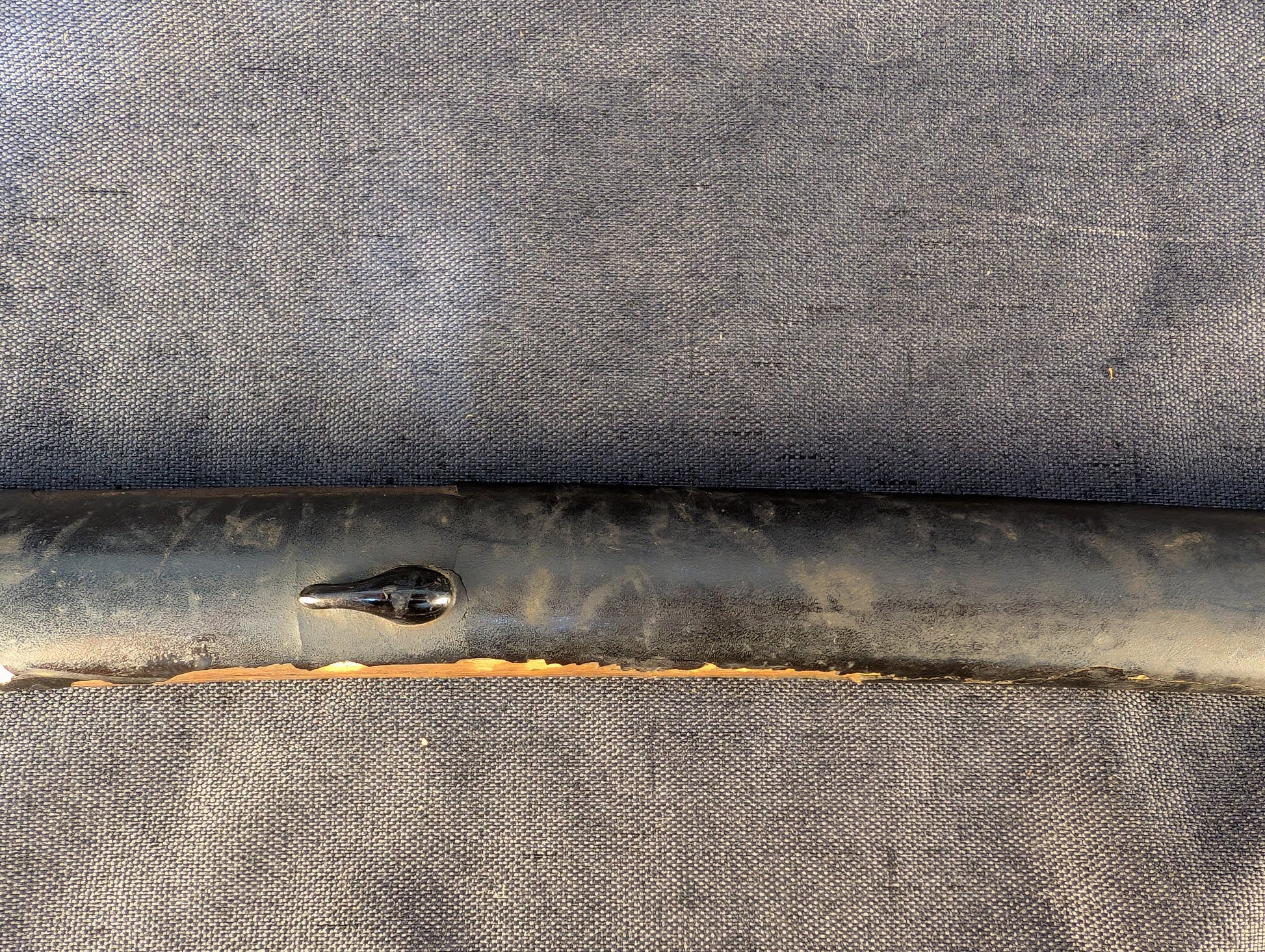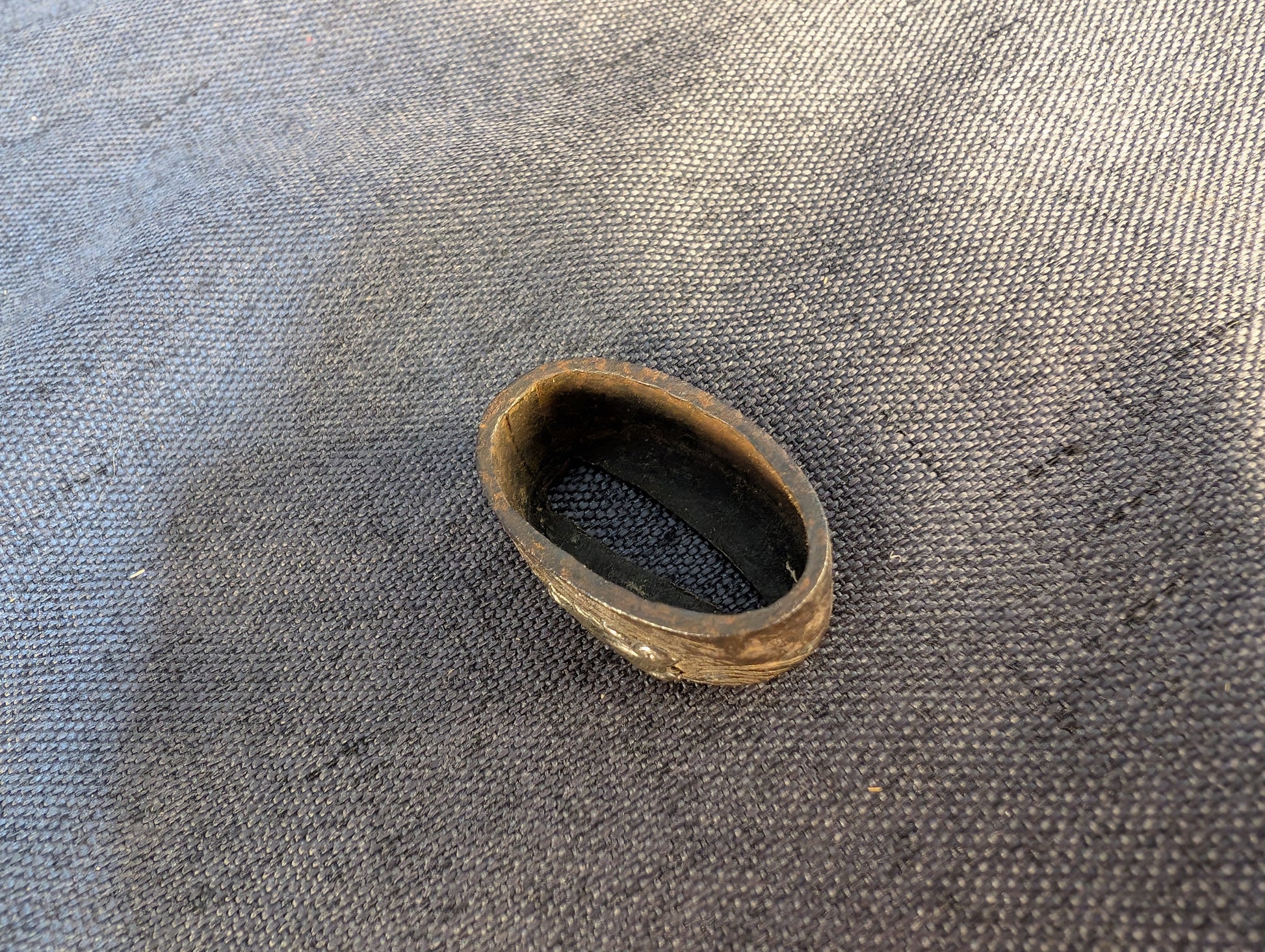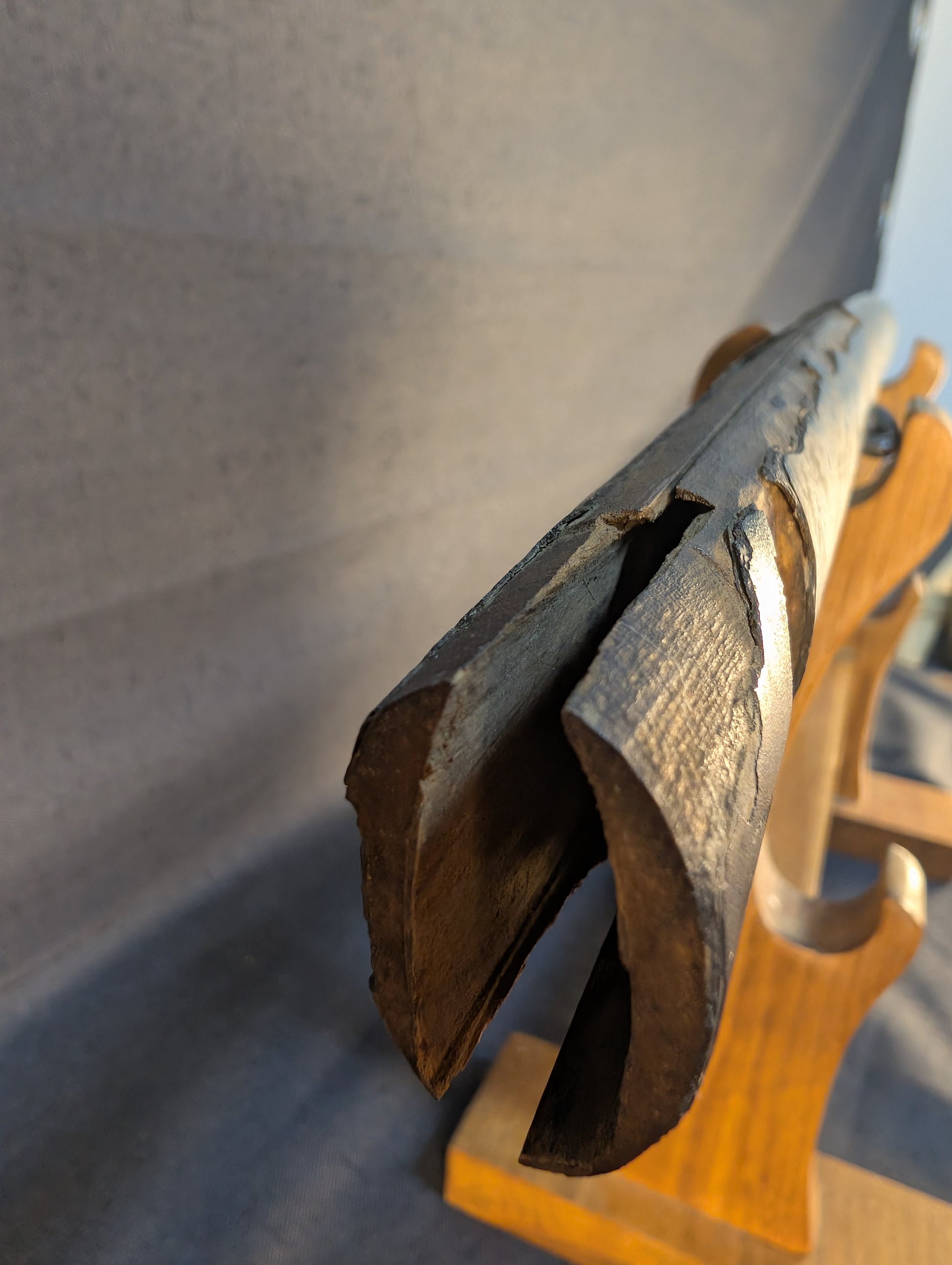 The koshirae fittings are of iron and mixed metal construction. The tsuba, a standout part of the ensemble, is a beautiful circular iron plate carved in low relief with a radiating sunburst pattern extending outward from the nakago-ana, a motif symbolizing clarity and vitality. The surface has a dark, stable patina with minor oxidation in the recesses. The fuchi and kashira are of matching iron with incised scrolling designs, softened with time yet still clear. The kashira shows a simple engraved floral pattern on its face, while the fuchi bears a lively depiction of a rabbit over waves, likely a reference to the hare of Inaba, a classic folktale lionized in wartime Japan. The menuki are of a chocolatey dark copper, their forms difficult to discern under the wrap, appearing to be schools of fish with scaley carved skin leaping over one another. The tsuka is wrapped in golden-brown silk ito in hineri-maki style over paneled samegawa made to appear to be a full wrap with a seam along the ura. The ito is intact but frayed in places, particularly near the mekugi-ana, where the peg hole is visible. The saya (scabbard) is of black lacquer, worn with age, showing areas of loss and small cracks but retaining its original form. Altogether, the fittings harmonize in an earthy and quietly dignified manner, displaying Edo-period craftsmanship without excessive ornamentation, showing a set of fittings that served out its life on a working blade.