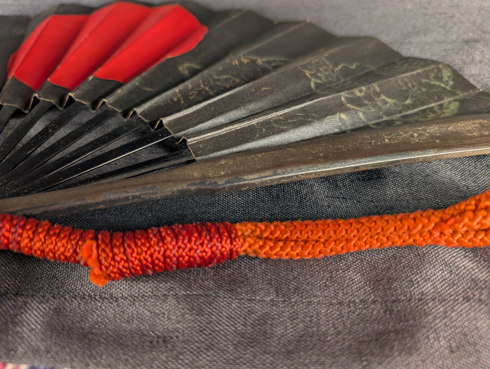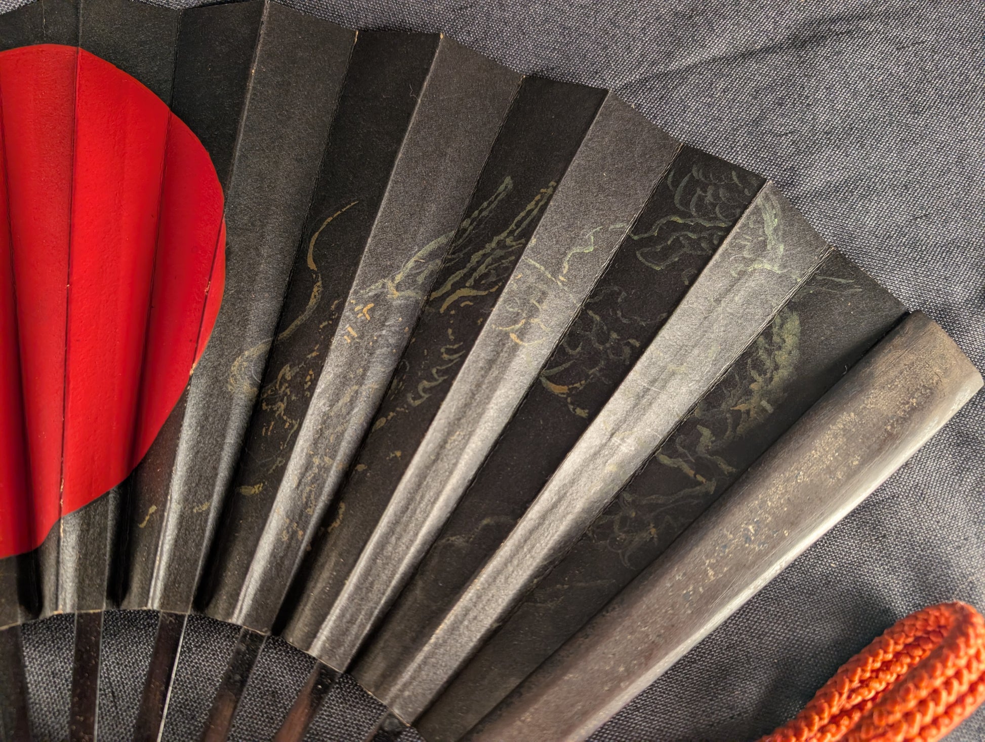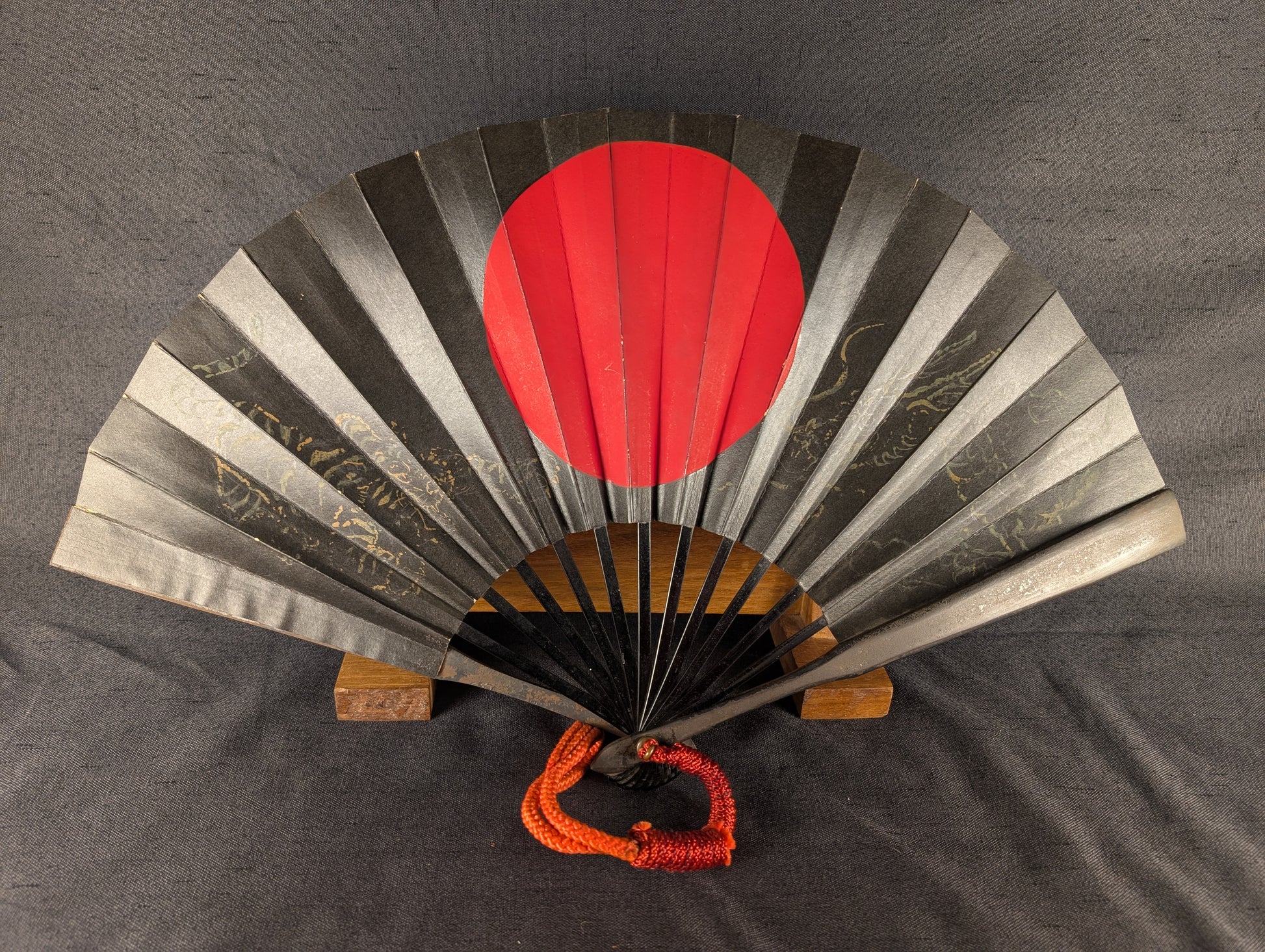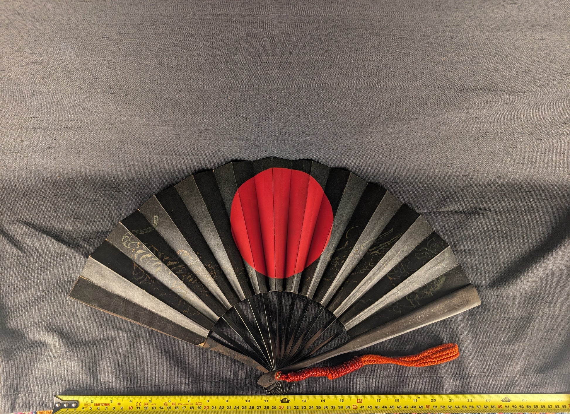 This well-crafted Japanese tessen displays a powerful combination of martial austerity and symbolic richness. The fan is imposing in size, nearly 60cm when opened, and extremely heavy, over 600g, more than three times heavier than typical examples. The fan’s surface is lacquered in deep black, centered by a bold red sun motif, an emblem of vitality, divinity, and the warrior spirit. Faintly visible beneath the lacquer are gilt-painted depictions of a dragon and tiger, traditional symbols representing the dual forces of heaven and earth, or yin and yang. The dragon, rendered in delicate linework, coils dynamically across one half of the fan, while the tiger crouches in the opposite field, both partially softened by age but still discernible in the right lighting. The paper surface shows some minor rubbing and crease wear consistent with age, while the underlying iron ribs remain solid and structurally intact, exhibiting a steady dark patina throughout. The tessen is completed with a vivid red silk kumihimo cord, in good condition, providing a striking contrast to the blackened metal.