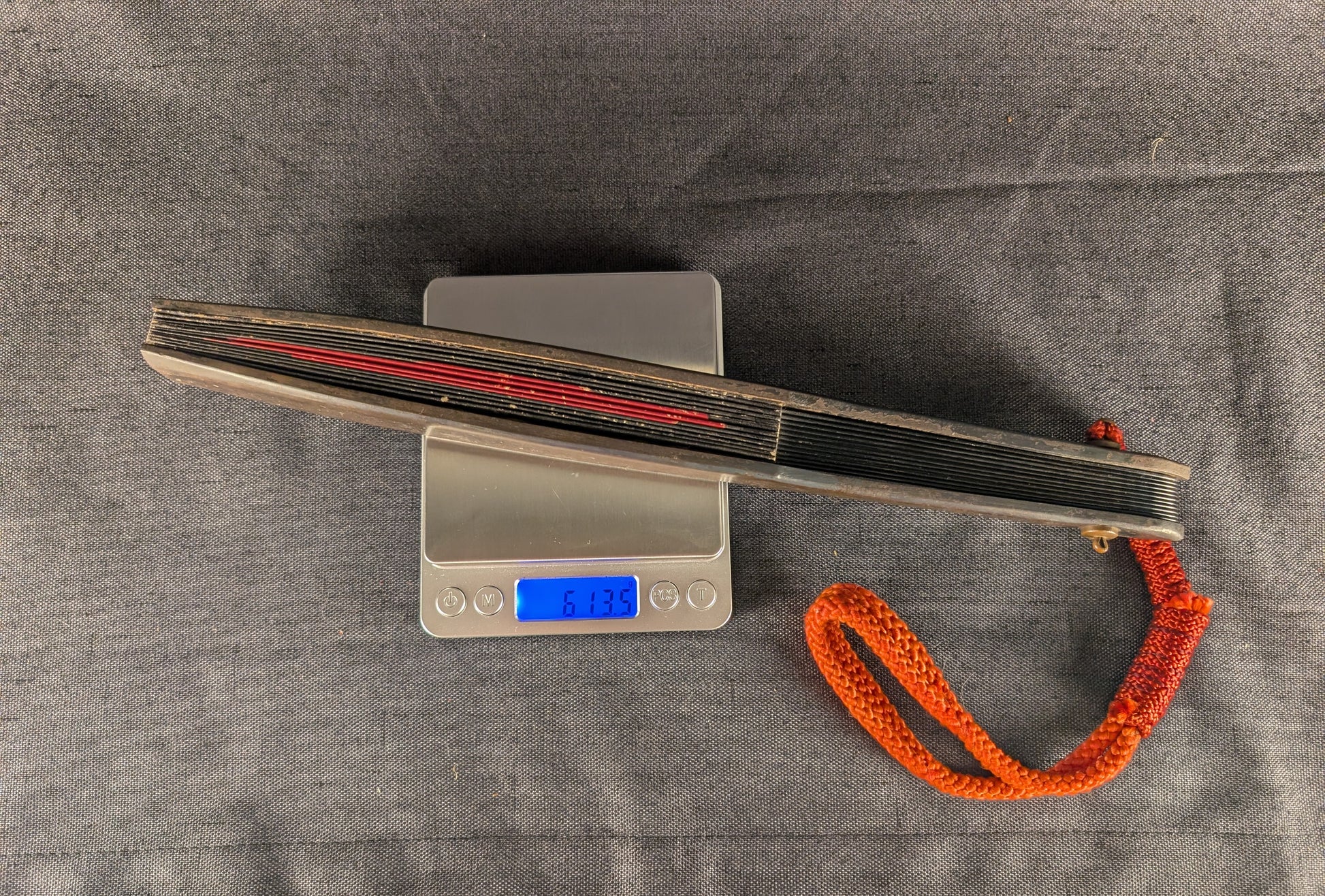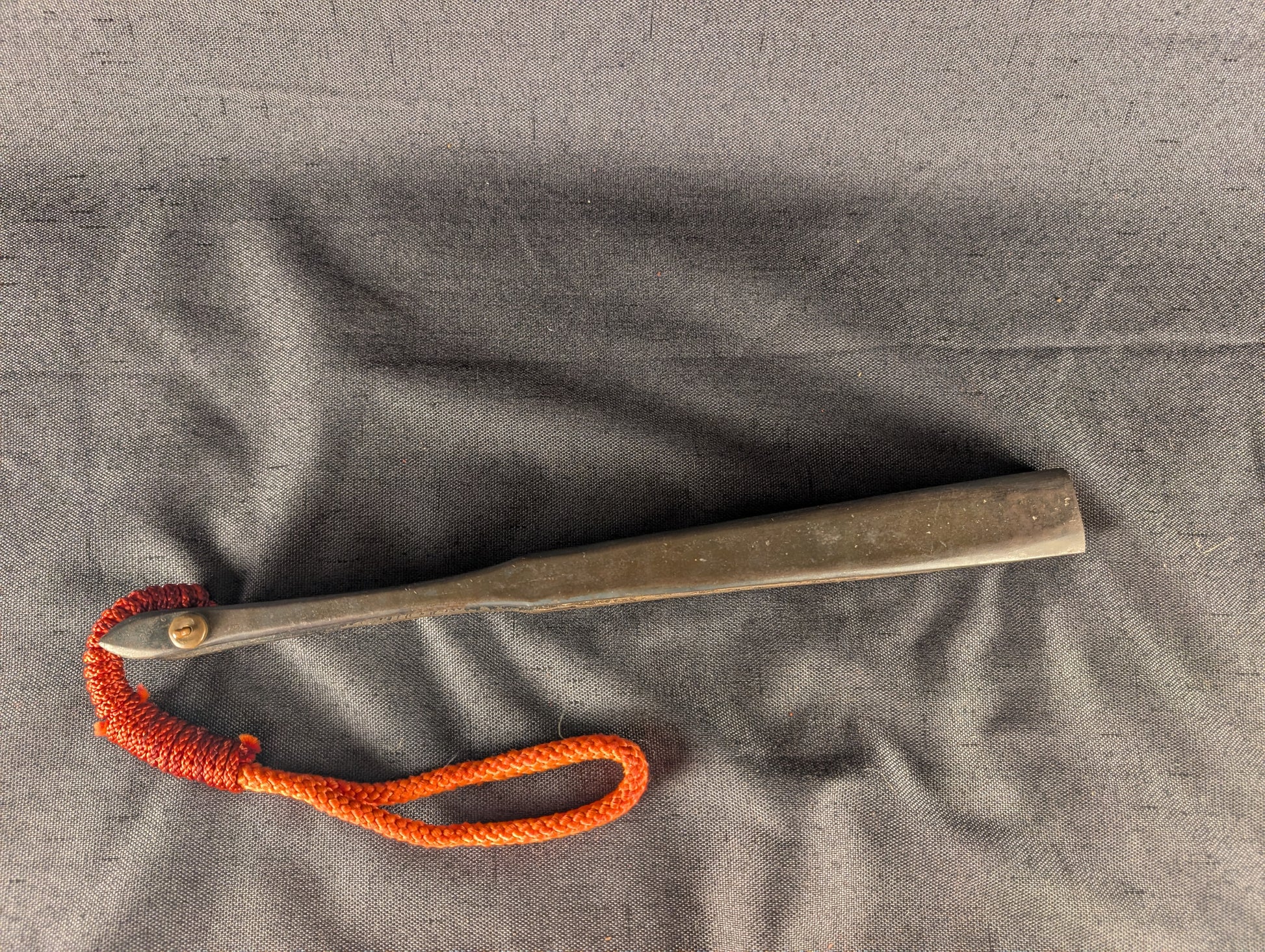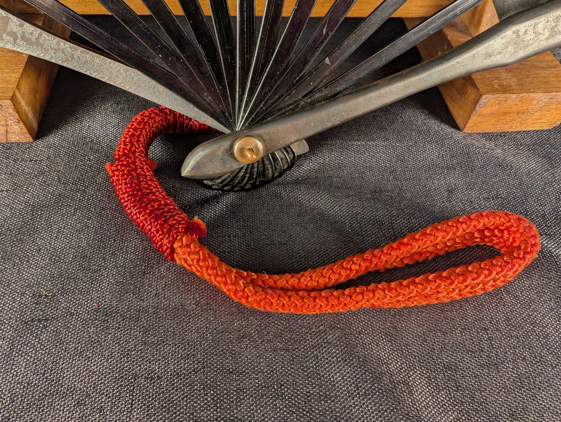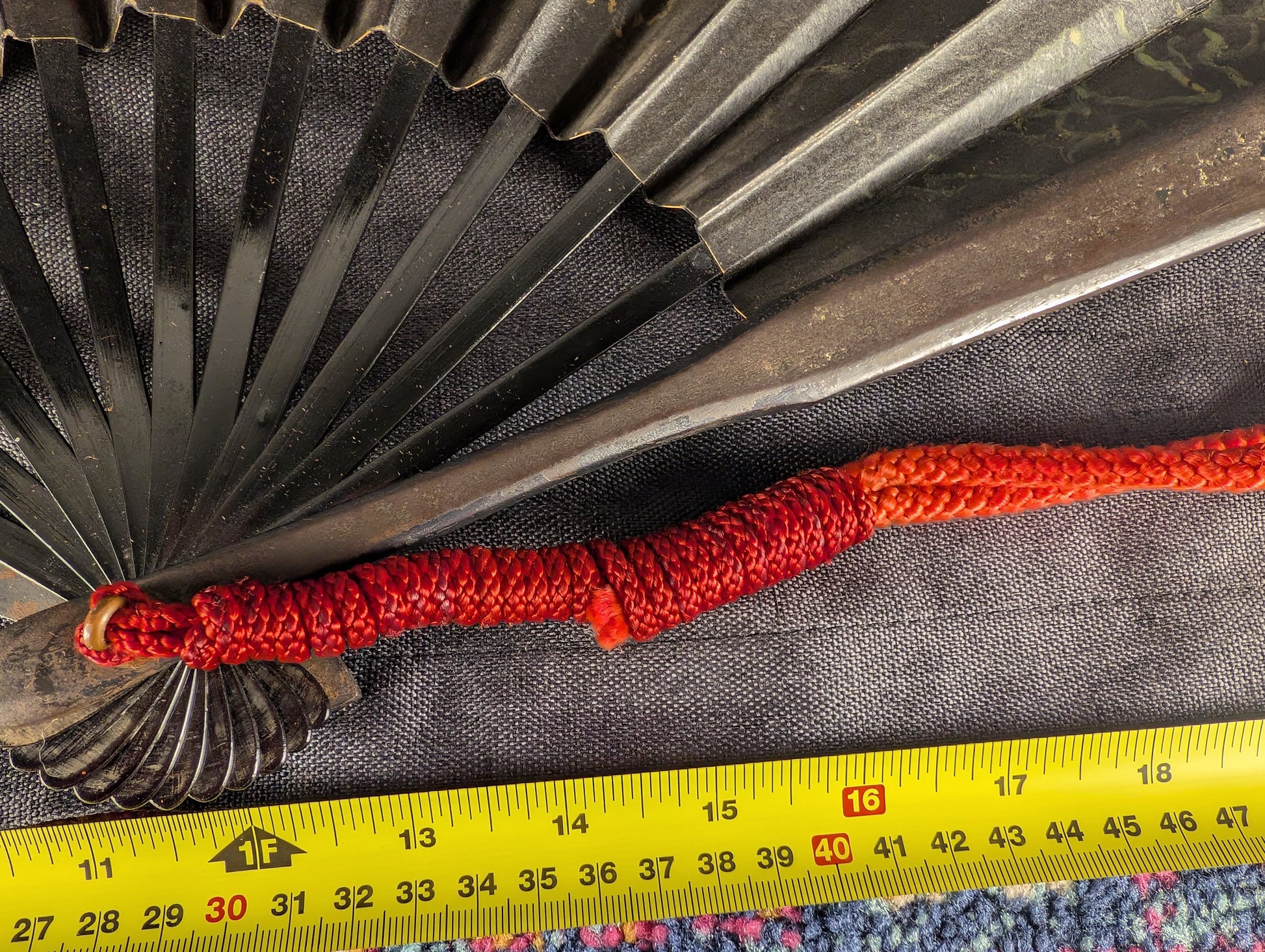 This well-crafted Japanese tessen displays a powerful combination of martial austerity and symbolic richness. The fan is imposing in size, nearly 60cm when opened, and extremely heavy, over 600g, more than three times heavier than typical examples. The fan’s surface is lacquered in deep black, centered by a bold red sun motif, an emblem of vitality, divinity, and the warrior spirit. Faintly visible beneath the lacquer are gilt-painted depictions of a dragon and tiger, traditional symbols representing the dual forces of heaven and earth, or yin and yang. The dragon, rendered in delicate linework, coils dynamically across one half of the fan, while the tiger crouches in the opposite field, both partially softened by age but still discernible in the right lighting. The paper surface shows some minor rubbing and crease wear consistent with age, while the underlying iron ribs remain solid and structurally intact, exhibiting a steady dark patina throughout. The tessen is completed with a vivid red silk kumihimo cord, in good condition, providing a striking contrast to the blackened metal.