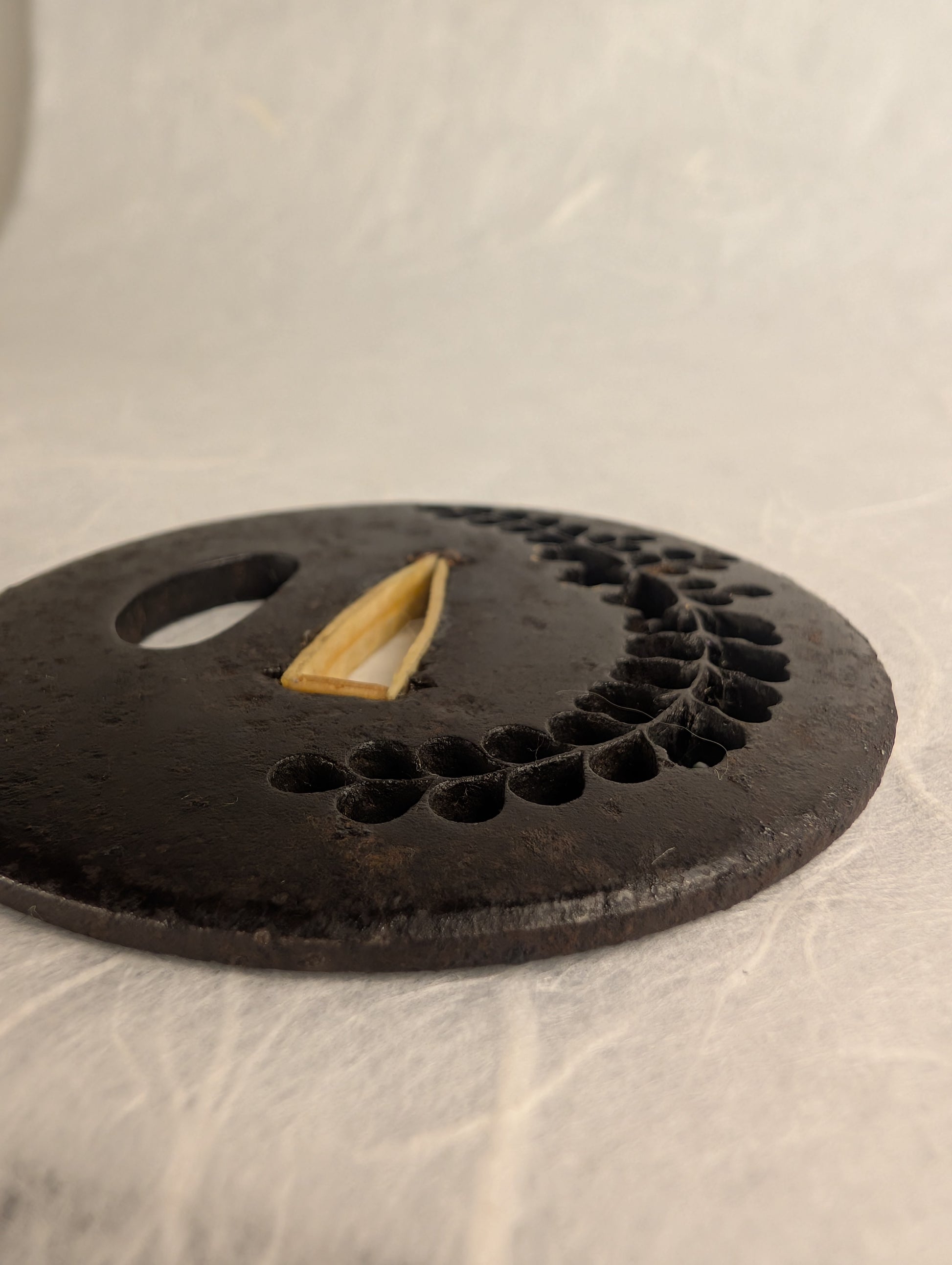 A well-balanced round (maru-gata) iron tsuba with an openwork (sukashi) design depicting a cascading branch of fern or willow leaves curving elegantly across the plate. The rhythm of the pierced leaves conveys a sense of flowing movement evoking nature’s grace and continuity. Motifs of this kind often symbolized humility and endurance, as the flexible fern or willow bends without breaking, aligning with the samurai ideal of quiet resilience. The clean symmetry of the design and the negative space it creates lend the piece a sense of refined restraint.