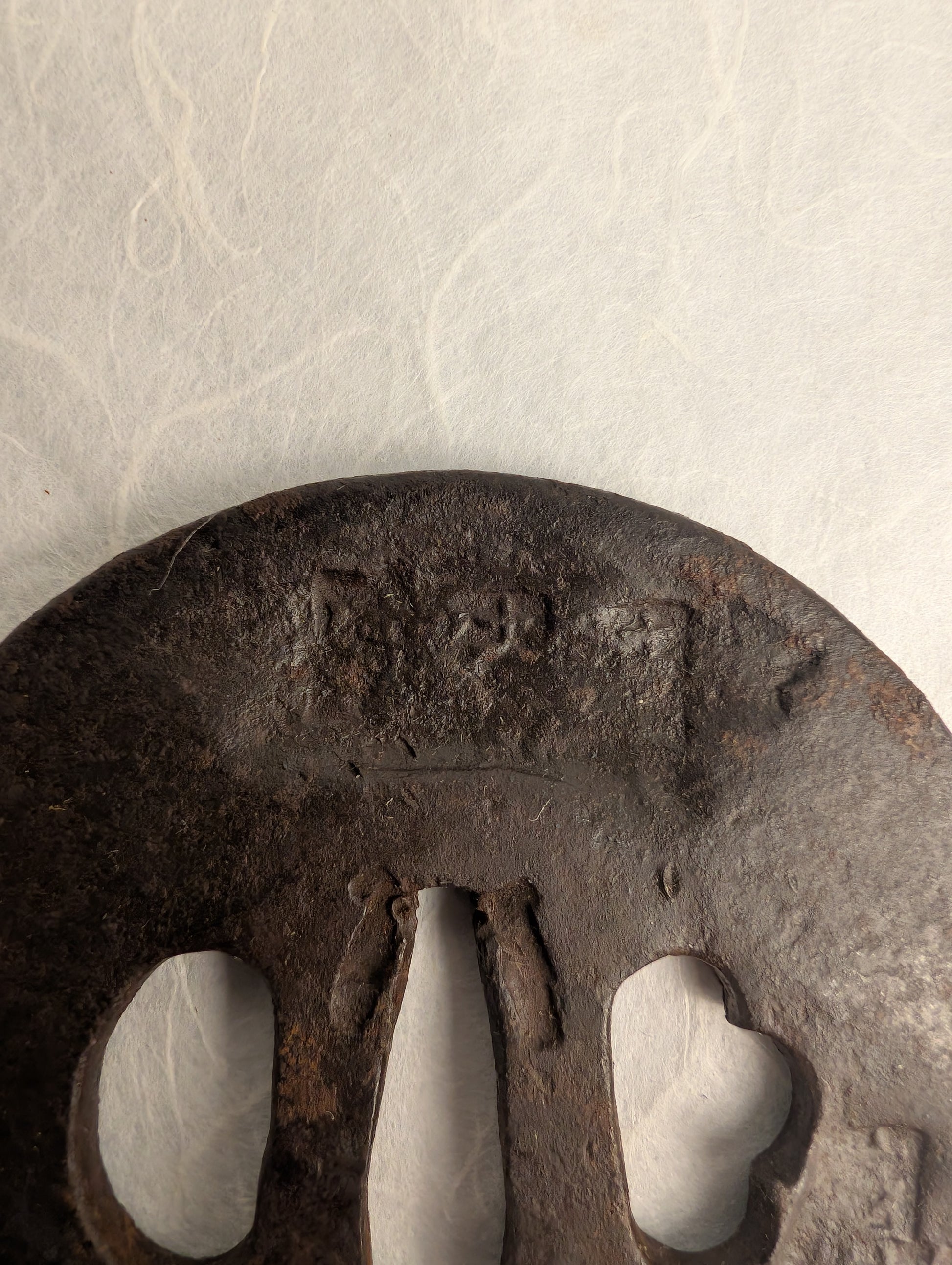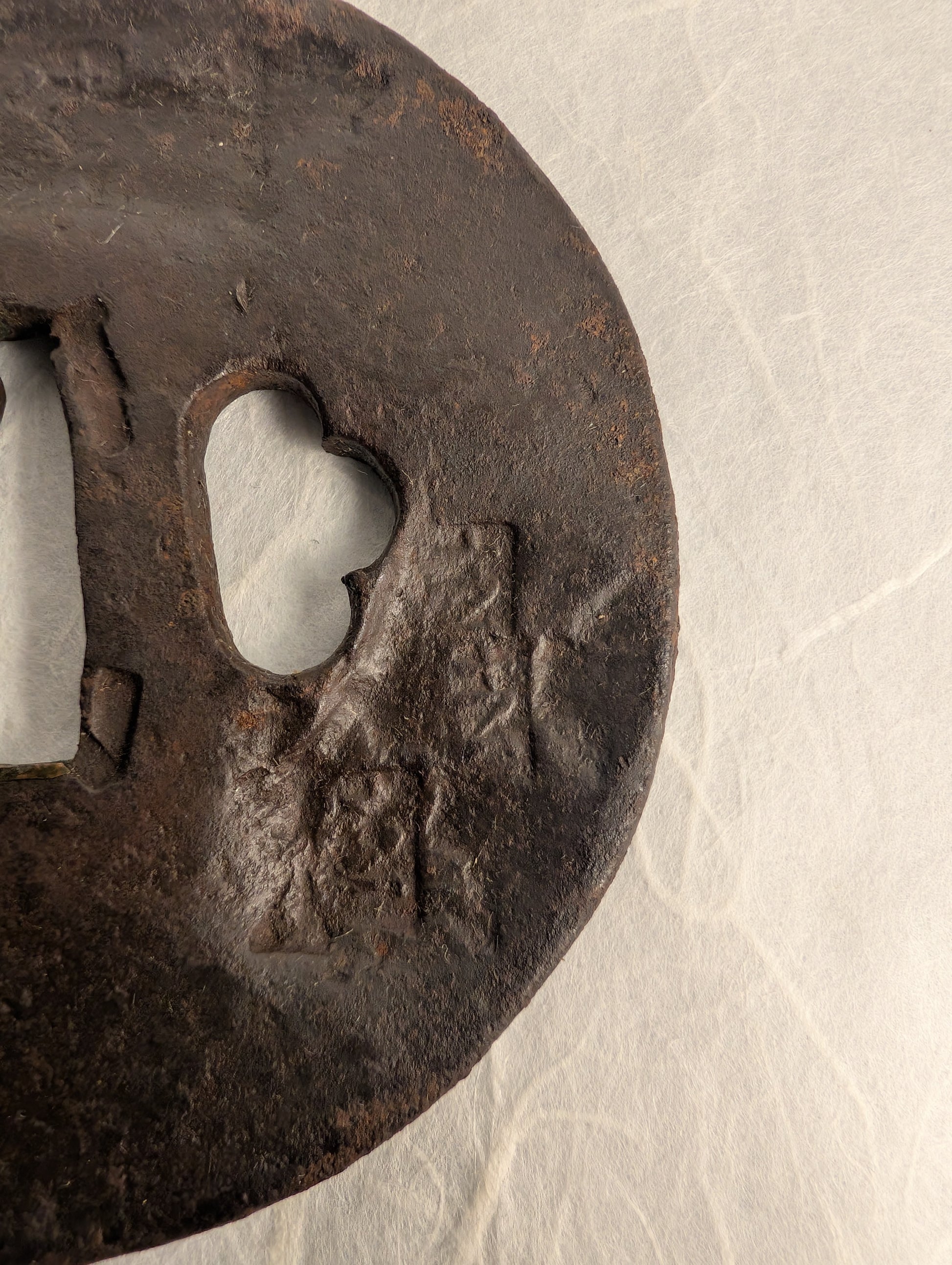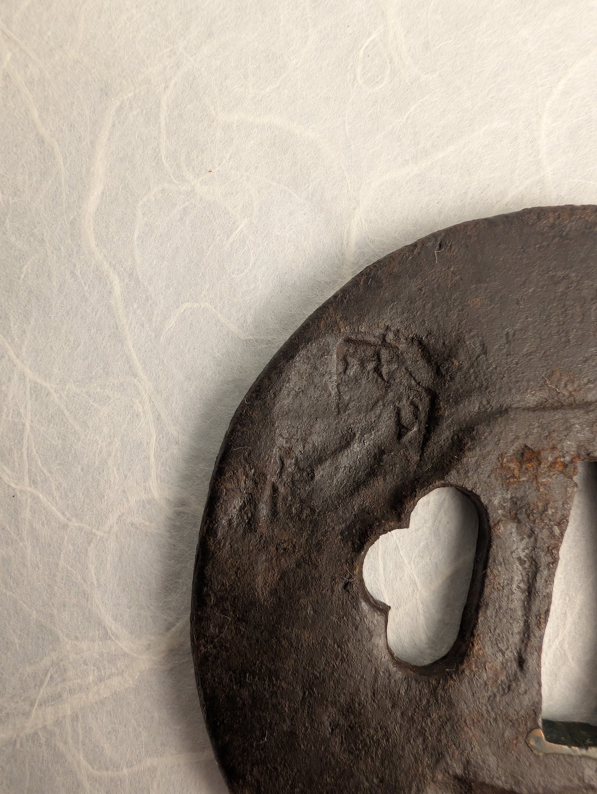 Forged from dense iron, the tsuba has developed a rich, dark brown patina through centuries of age and handling. Very deep hammer marks depict abstract shapes, giving a sense of dimension to the piece without distracting imagery.