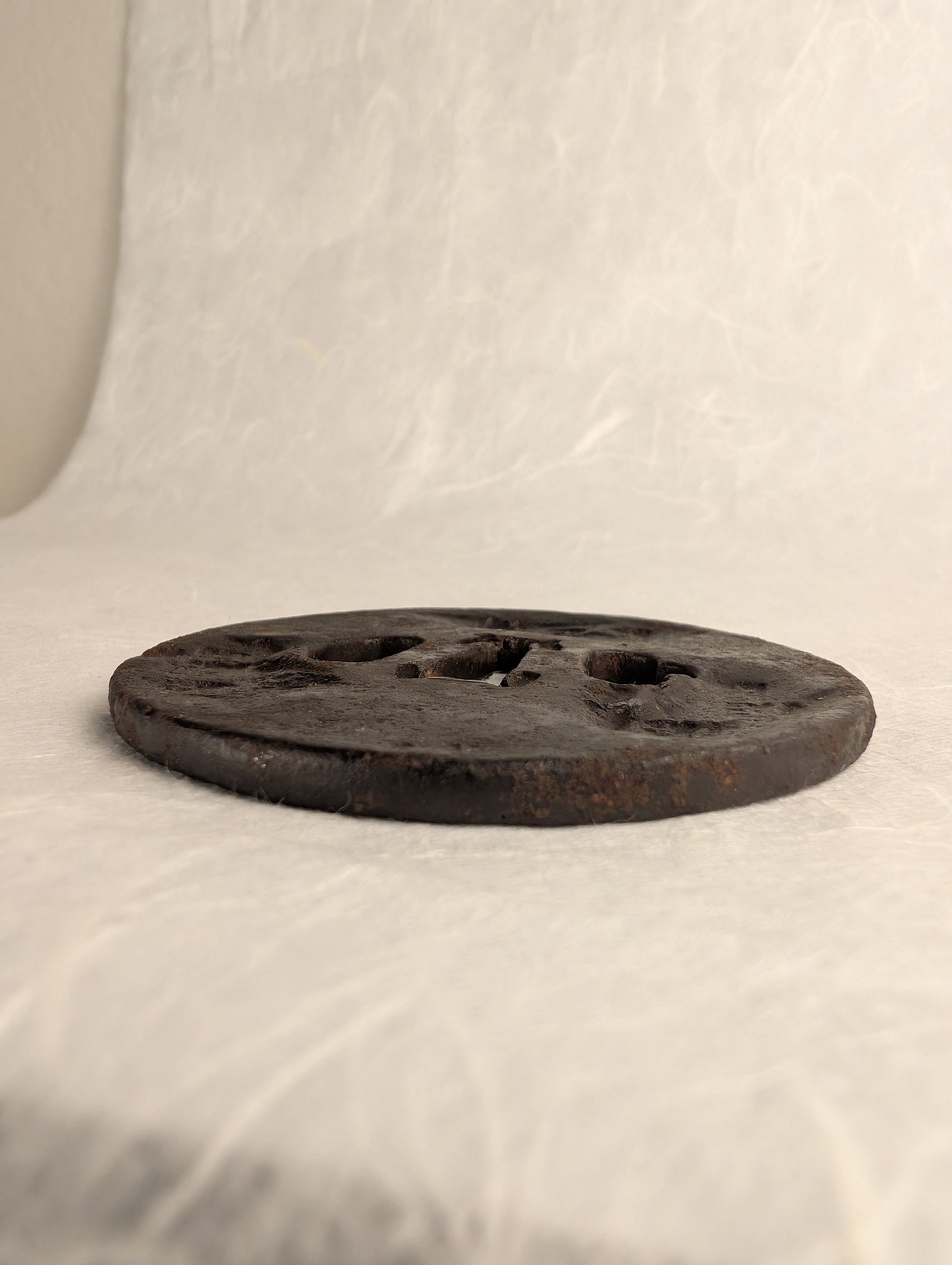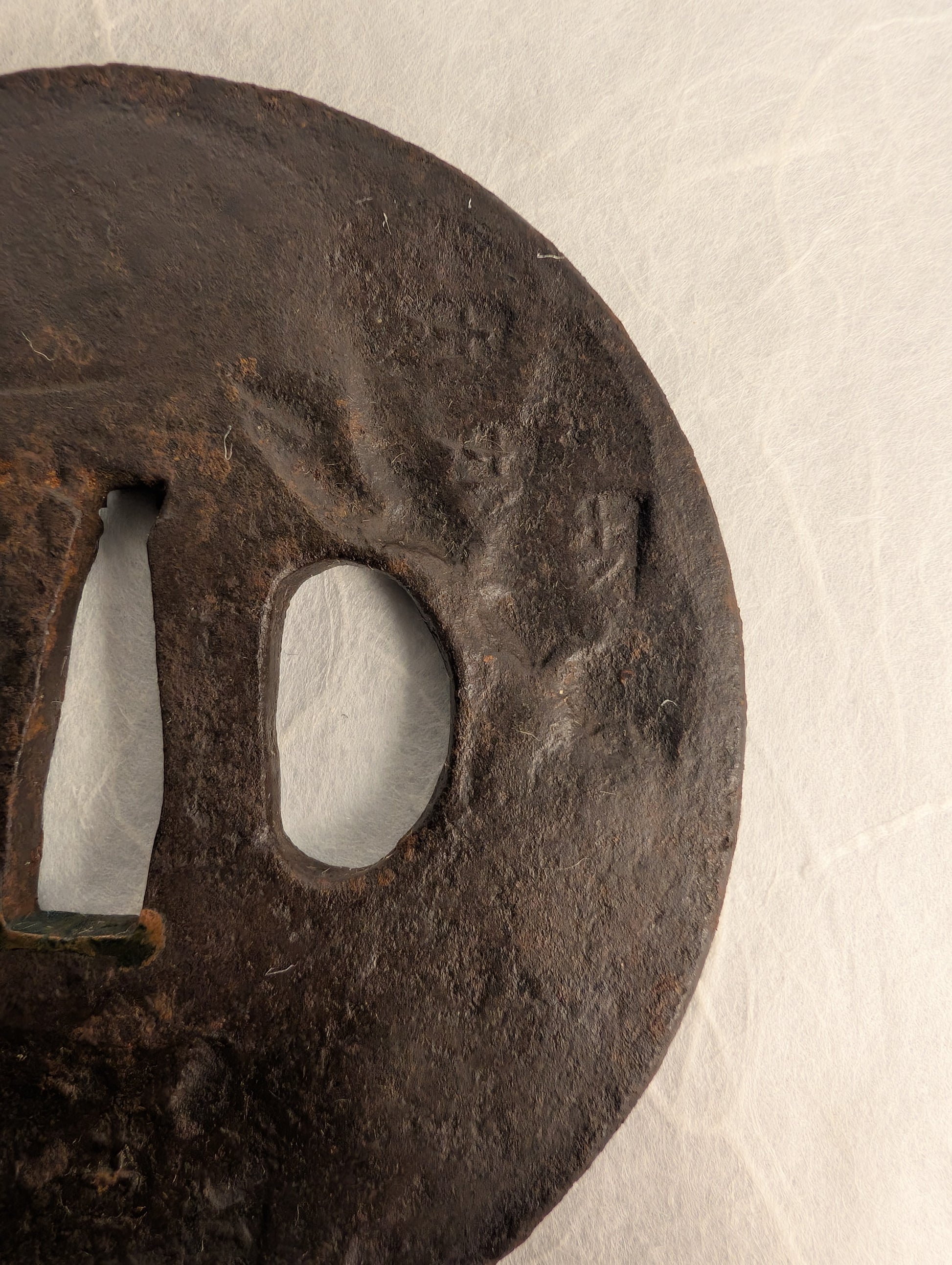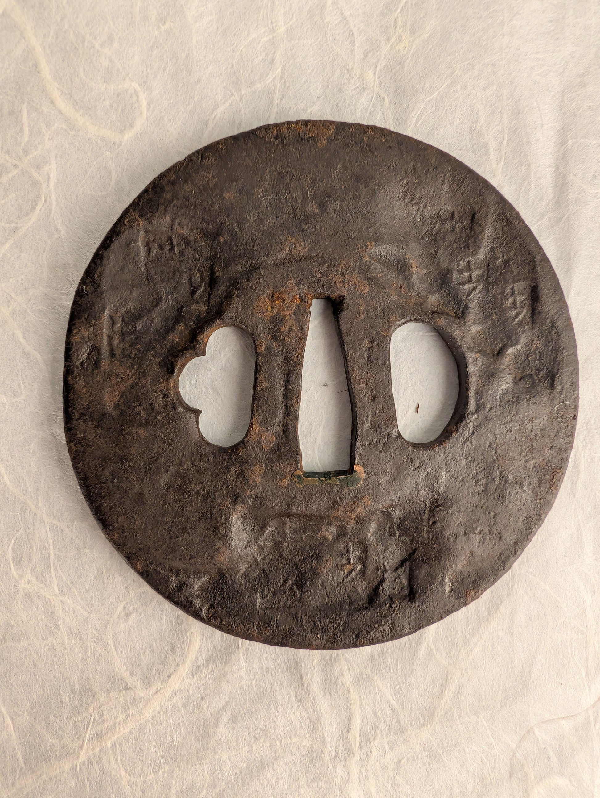 Forged from dense iron, the tsuba has developed a rich, dark brown patina through centuries of age and handling. Very deep hammer marks depict abstract shapes, giving a sense of dimension to the piece without distracting imagery.