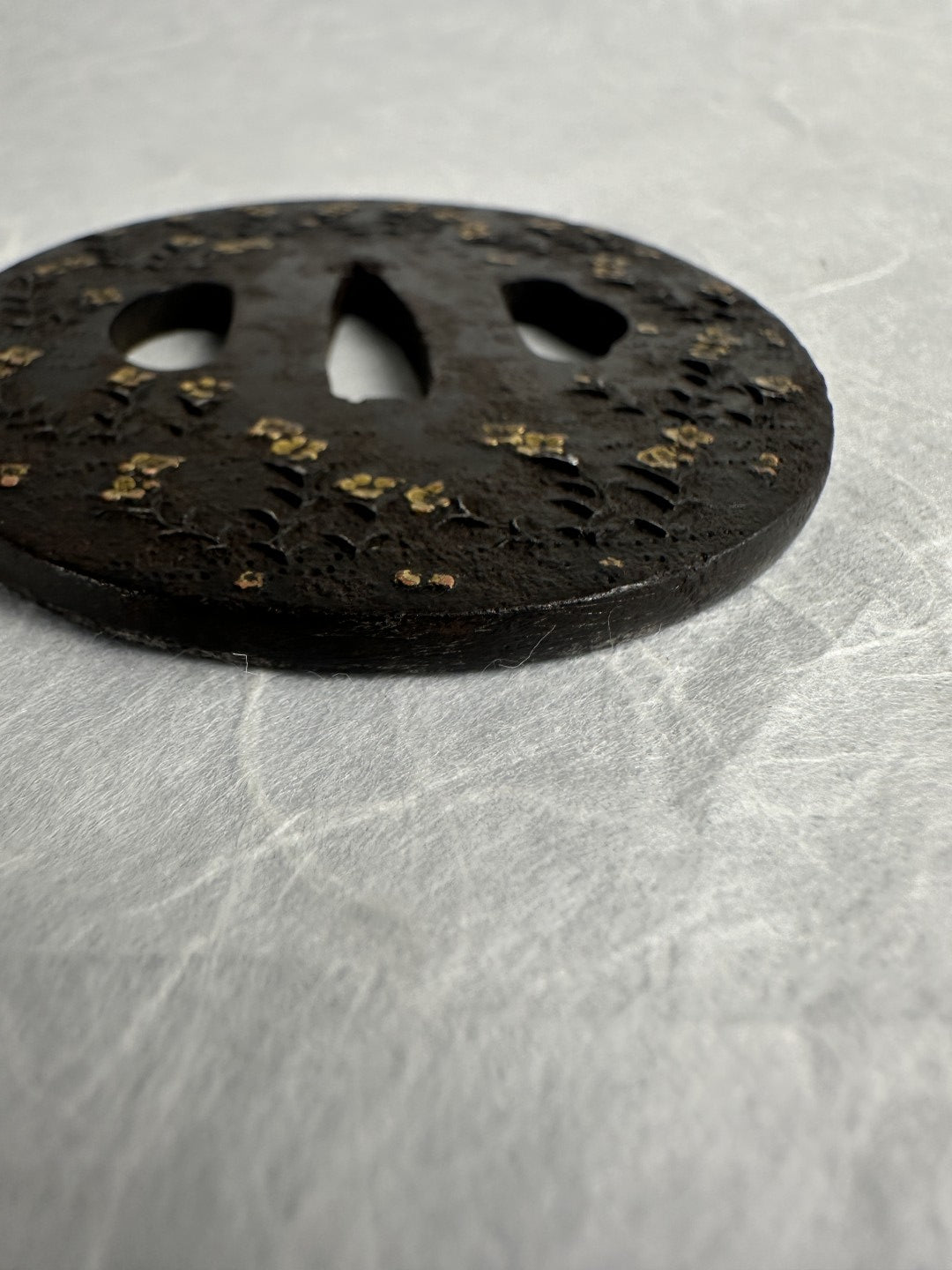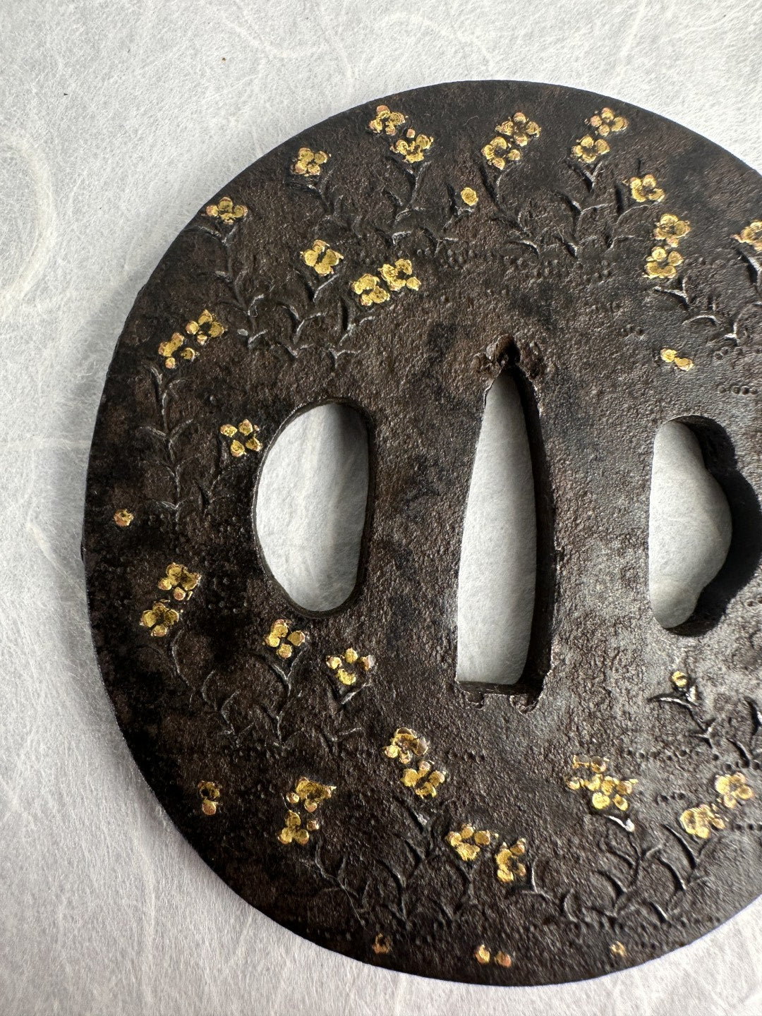 A refined round iron tsuba featuring a profusion of lively blossoms rendered in gold inlay. The blossoms, scattered across the surface in a natural yet rhythmic pattern, evoke the quiet strength and renewal of early spring, when plum trees bloom amid the last chill of winter. Despite scattered wear and minor losses in the gold inlay, the decoration remains vivid and attractive.