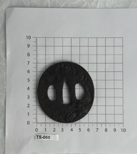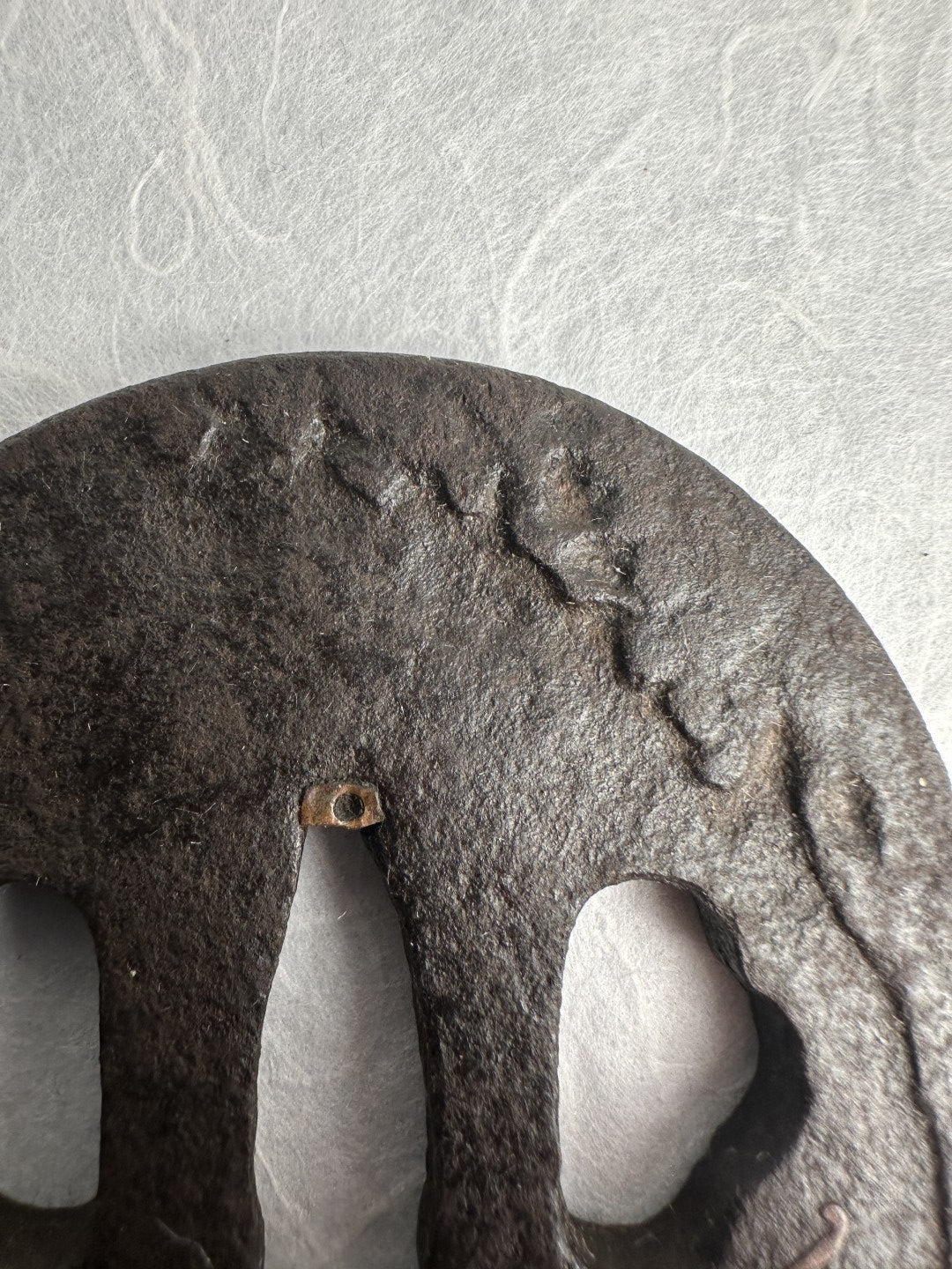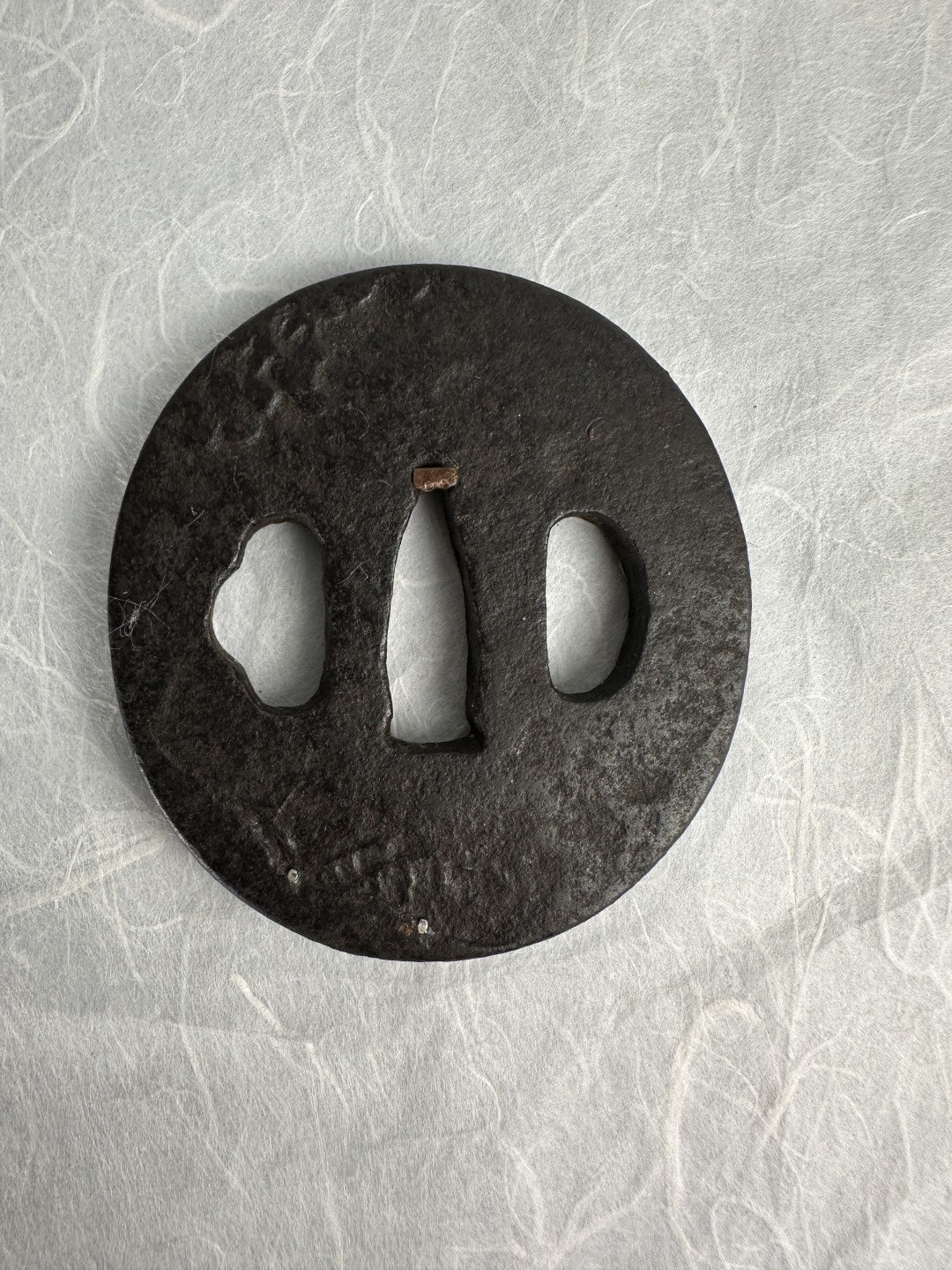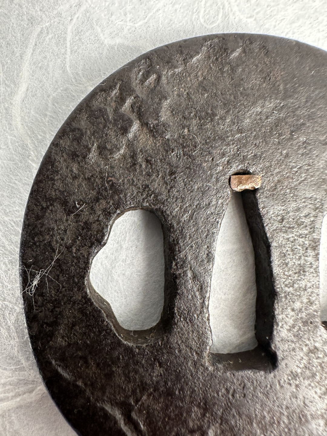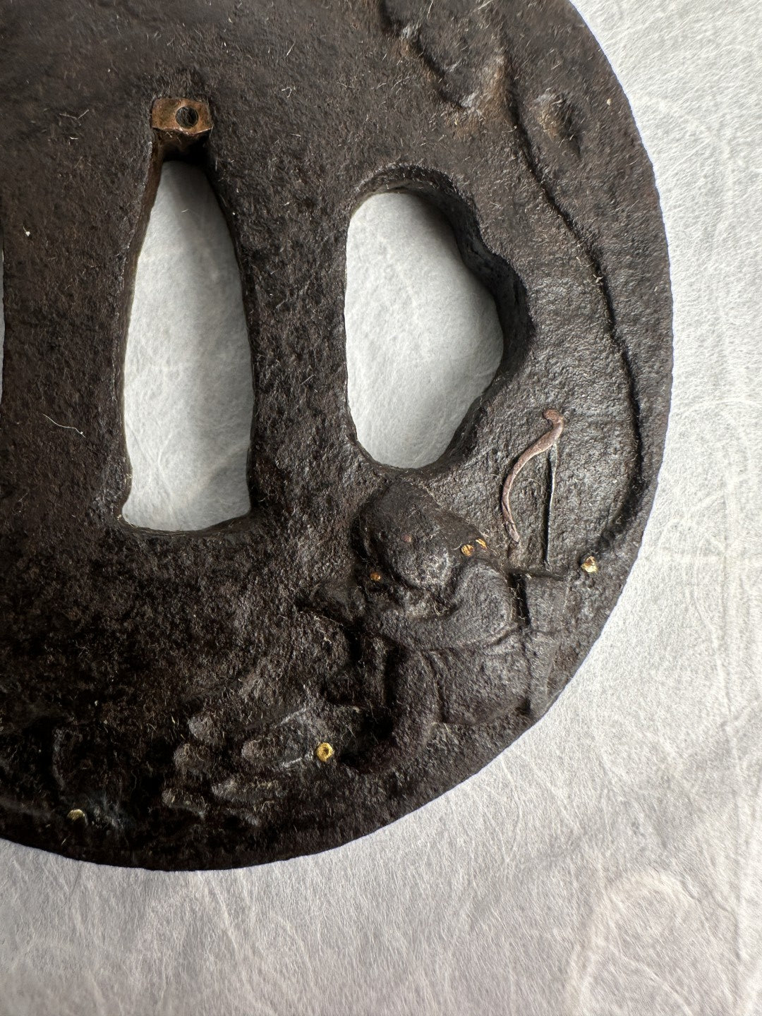 This round (maru-gata) iron tsuba features a rustic and deeply patinated surface depicting a seated archer looking off into the distance with a contemplative feel. Small but attractive mixed metal inlays highlight the piece.
