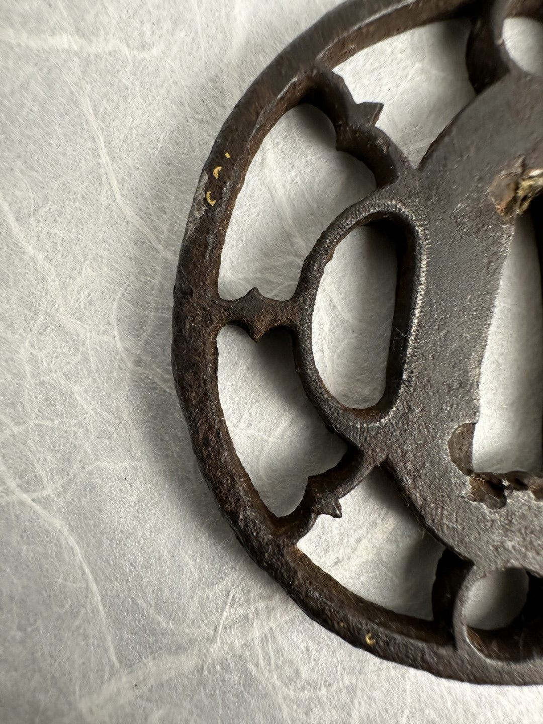 The iron shows a rich, dark brown patina, slightly granular in texture, consistent with age and exposure. The openwork is well defined with smooth, deliberate edges, and the nakago-ana shows signs of use, with minor wear visible around the aperture and evidence of copper sekigane inserts—one of which appears partially lost or removed. Traces of a little gold nunome work remain, but are mostly gone.