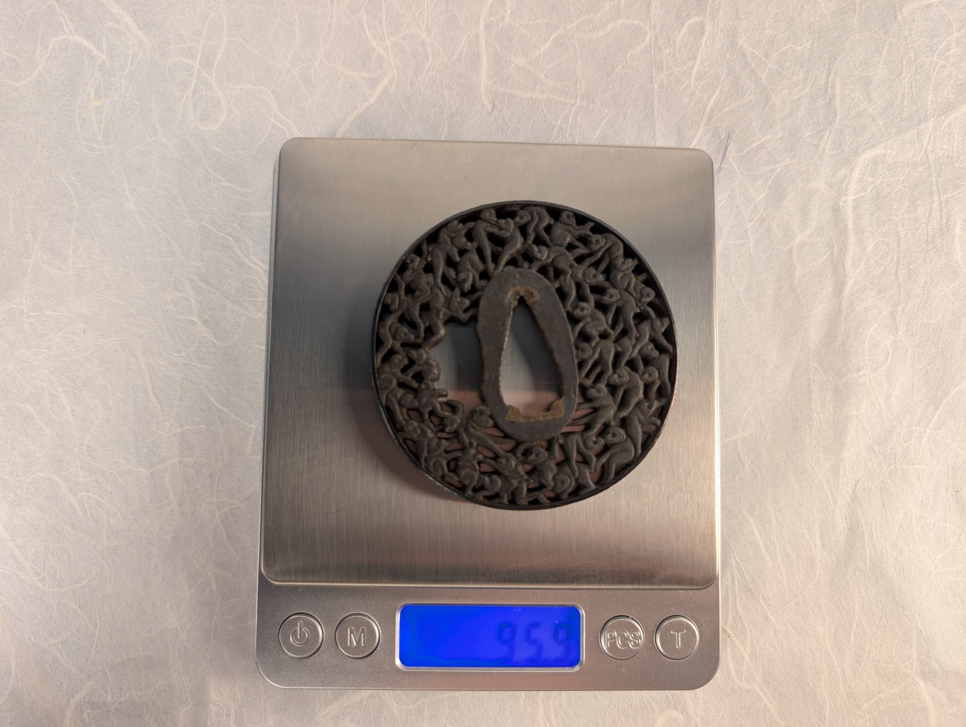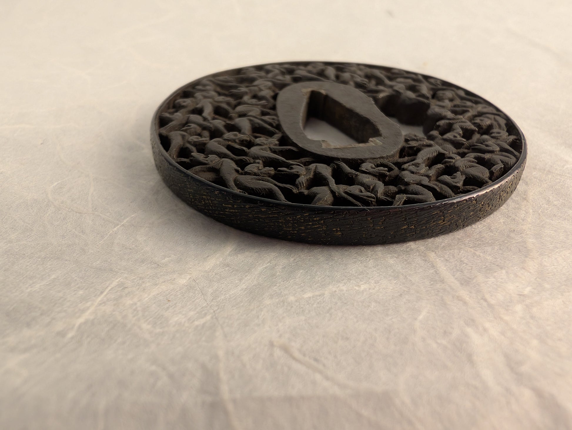 Forged from iron, the tsuba exhibits deep, well-defined carving with sculptural three-dimensionality. The rim (mimi) is smooth and rounded, framing the active composition within. The openwork demonstrates careful undercutting and thoughtful composition, allowing the figures to appear intertwined yet individually discernible. The patina is even and stable, with light reddish-brown oxidation in recesses that enhances the sense of depth. The nakago-ana shows traces of careful adjustment, possibly from original mounting. Despite its complexity, the structure remains sturdy, with no visible cracks or major damage.