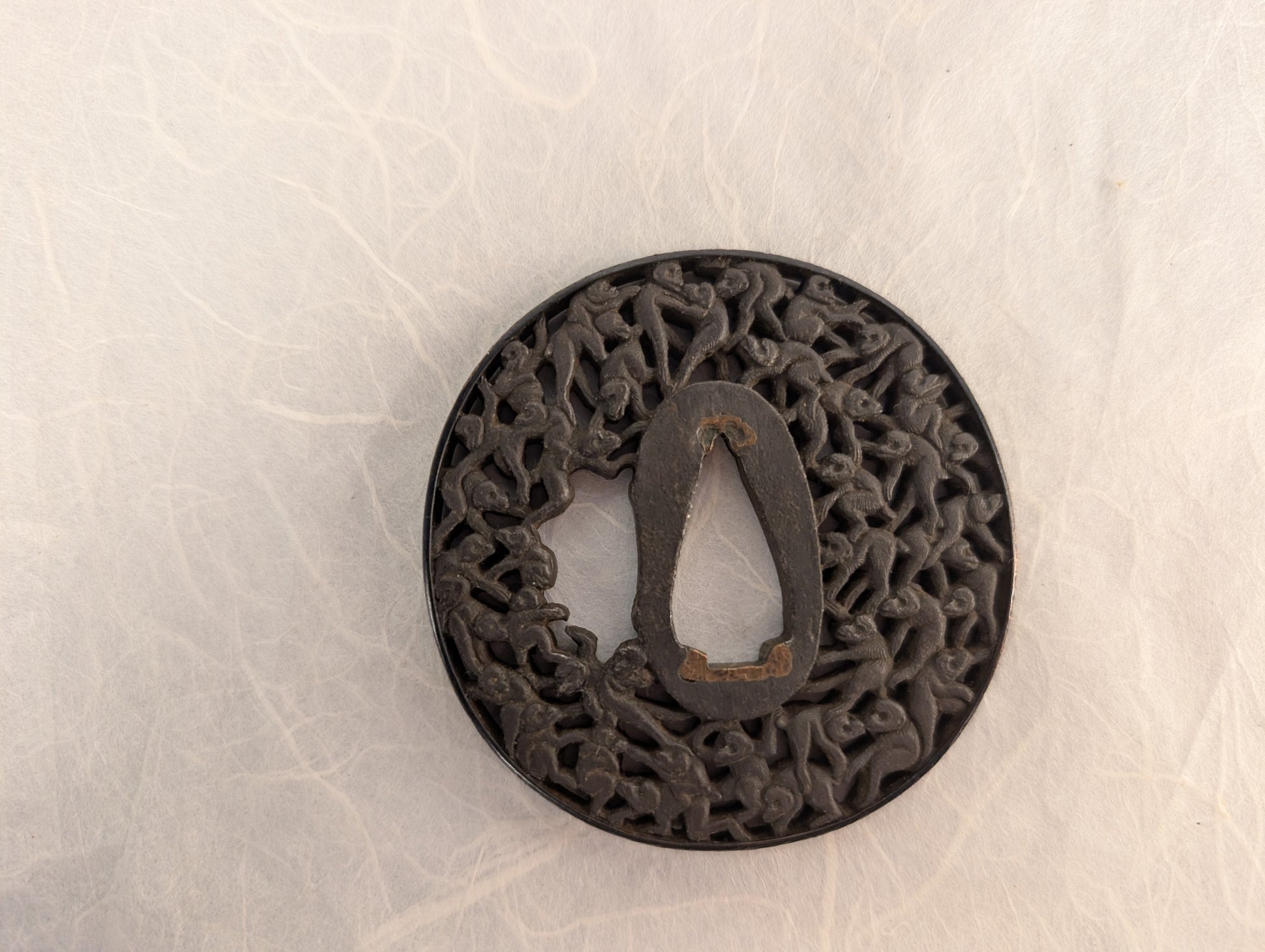This intricate openwork (sukashi) tsuba presents an extraordinary design of climbing monkeys rendered in dense, overlapping relief. Each figure is individually formed, grasping and entangling with its neighbors in a dynamic circular pattern that fills the plate entirely. The motif of monkeys (saru) has long been associated with intelligence, playfulness, and protection from evil spirits in Japanese folklore. On swords, such imagery could carry both charm and humor, offering a talismanic safeguard for the bearer while showcasing the artisan’s remarkable control of form and rhythm.