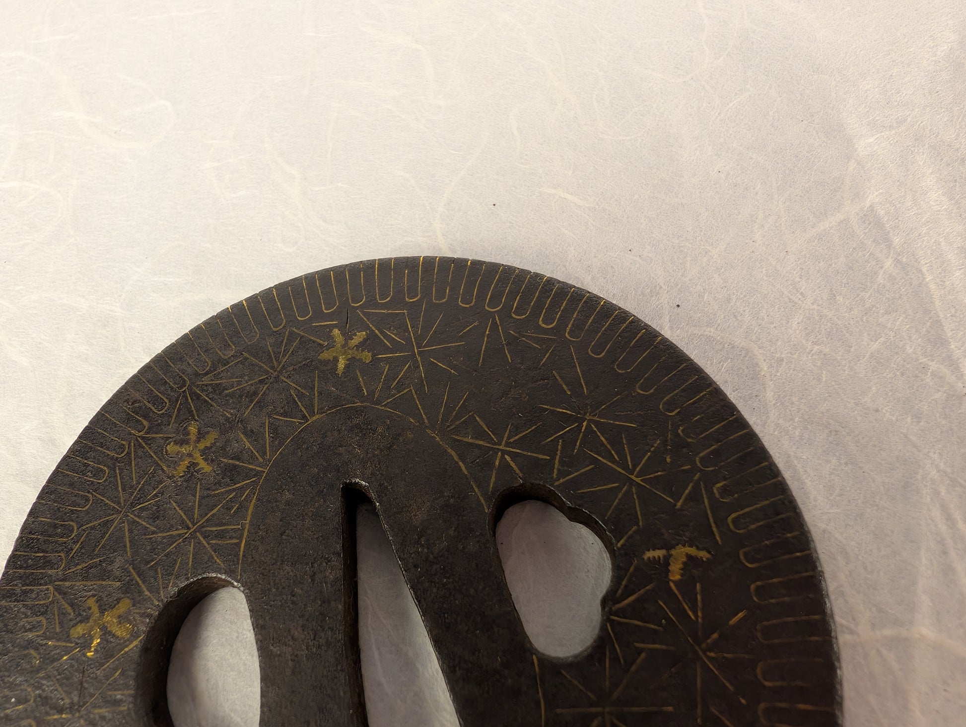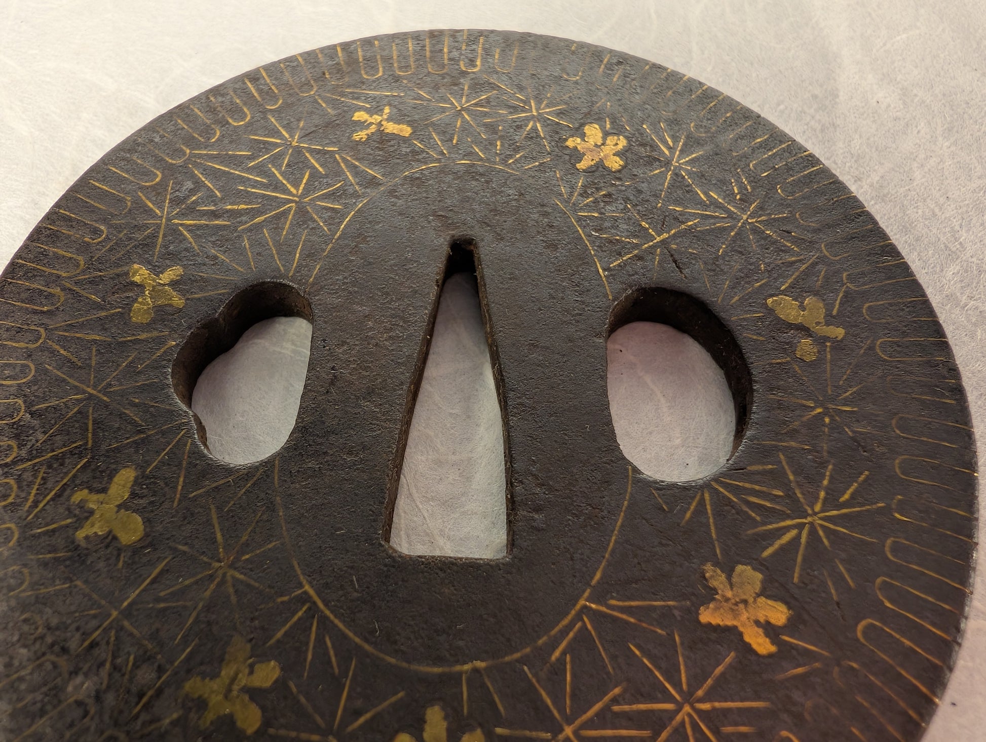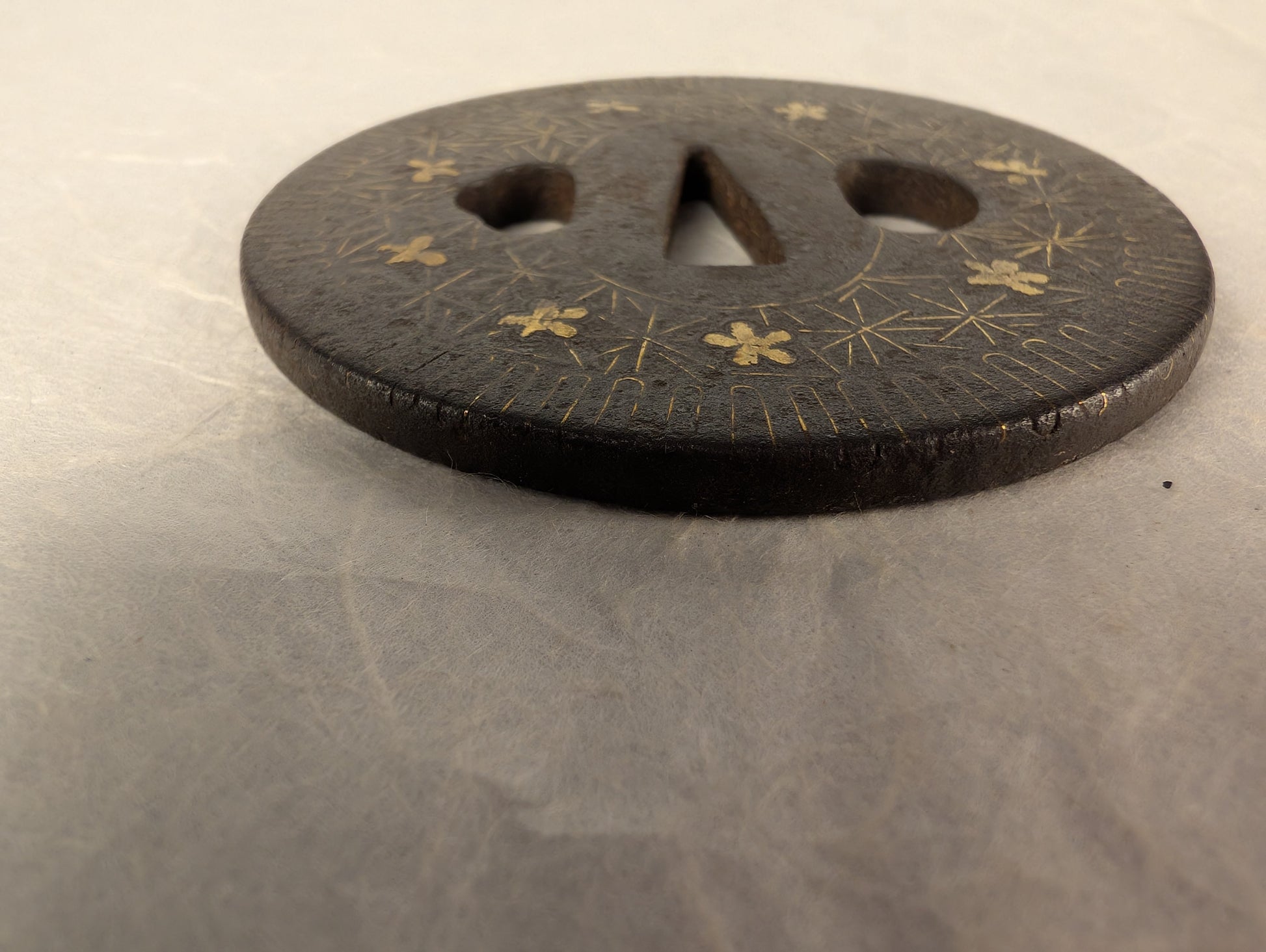 This iron tsuba is of round form with a well-defined seppa-dai and oval kogai-ana and kozuka-ana flanking a tapered nakago-ana. The plate is finished in a dark, compact iron with a naturally developed patina, showing a fine granular surface consistent with age and handling. The surface is decorated with gold nunome, scattered asymmetrically around the plate. A band of fine linear incisions runs near the rim, creating a subtle framing effect and adding visual rhythm to the composition. The gold inlay is partially worn in places, but remains clearly legible and well integrated into the design. Overall, the workmanship suggests a decorative yet restrained Edo-period piece intended to balance visual interest with practical durability.