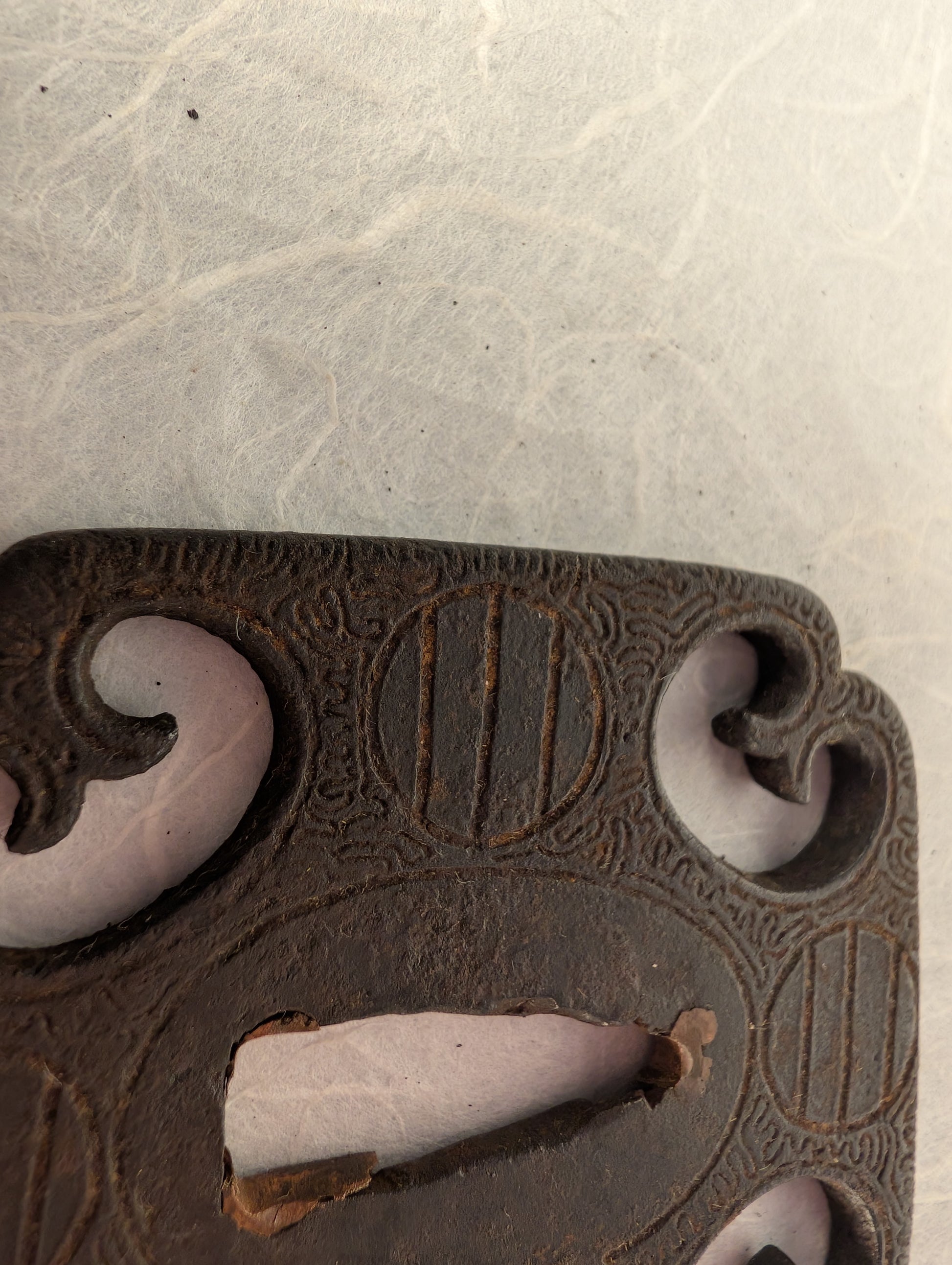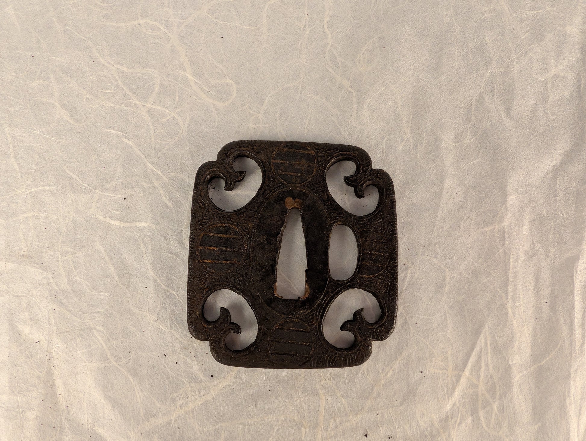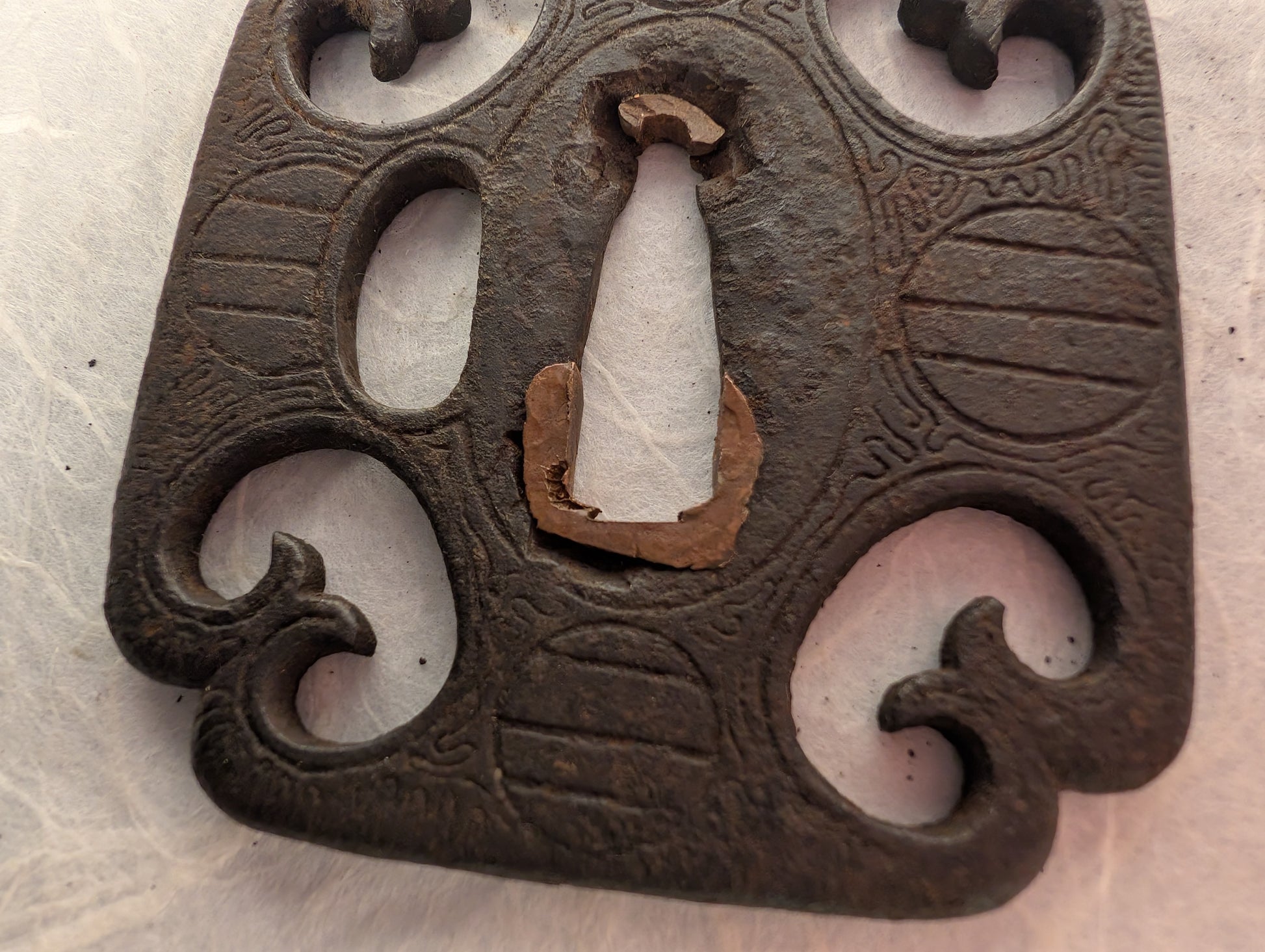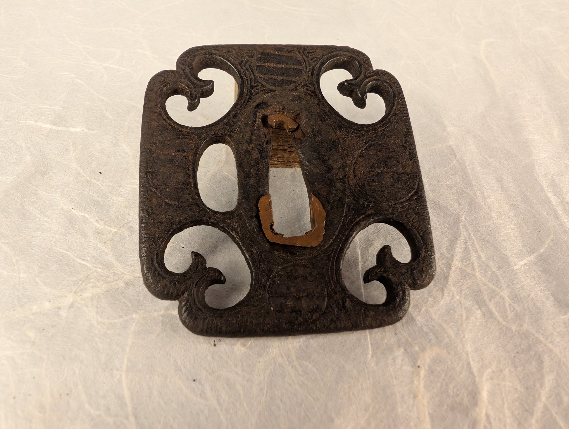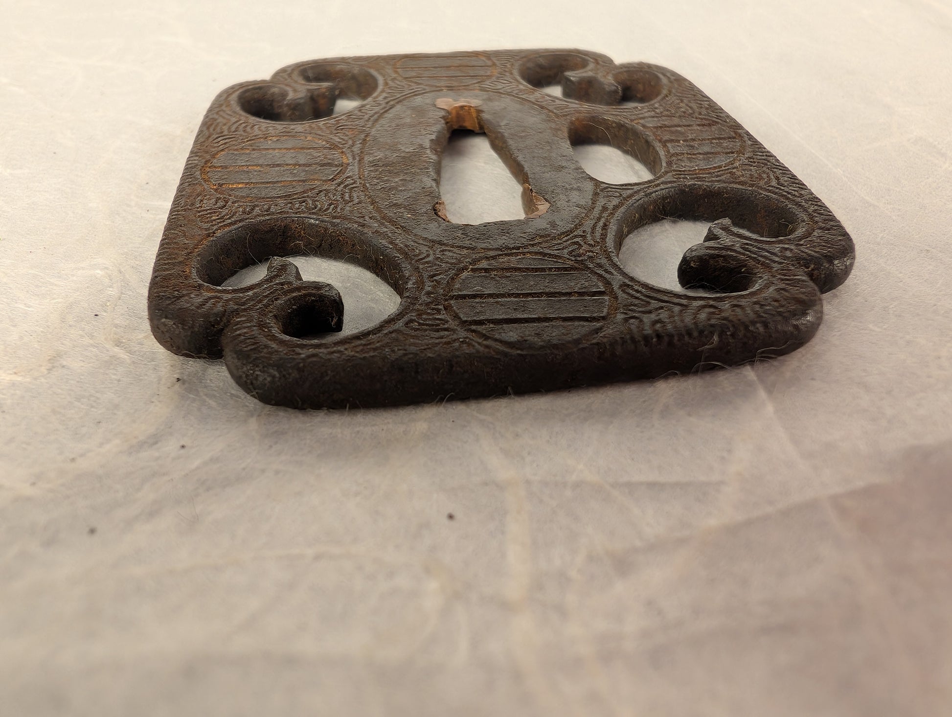 This square iron tsuba is of maru-gata form with softly rounded corners and an openwork design composed of four inward-facing scrolling elements arranged symmetrically around the central nakago-ana. The overall composition is balanced and restrained, with the negative space playing an important role in the visual rhythm of the piece. The plate surface is worked with a finely textured ground, showing shallow carved lines and subtle undulating patterns that give the iron a lively, tactile quality. Within the fields between the sukashi elements are shallow circular and banded motifs. The iron has developed a dark brown to black patina with areas of lighter oxidation and surface wear consistent with age and handling.