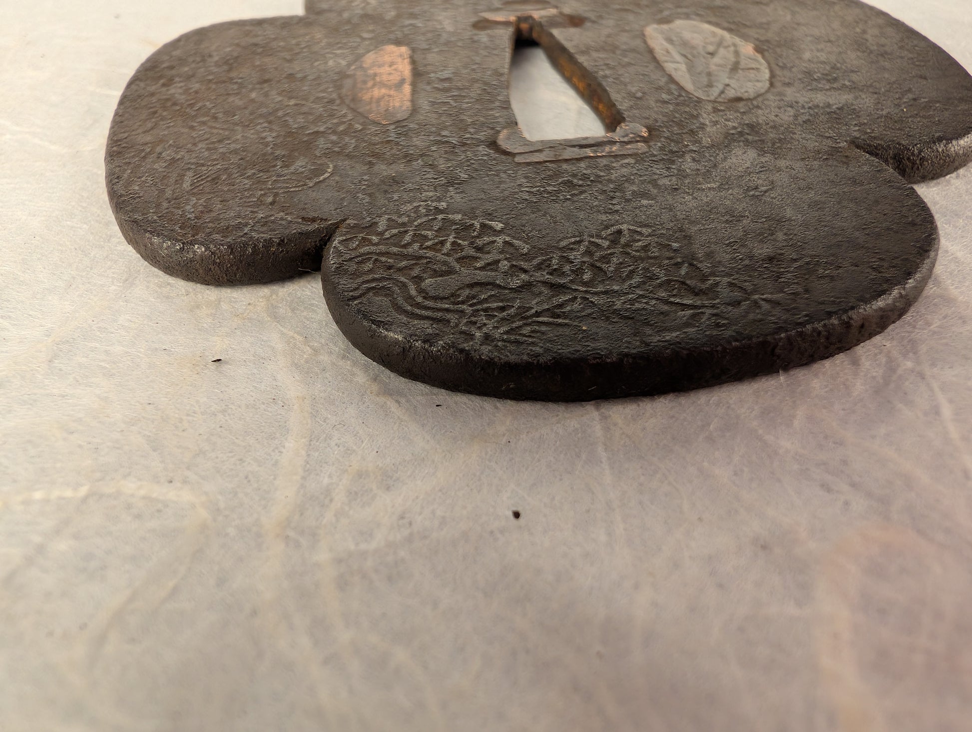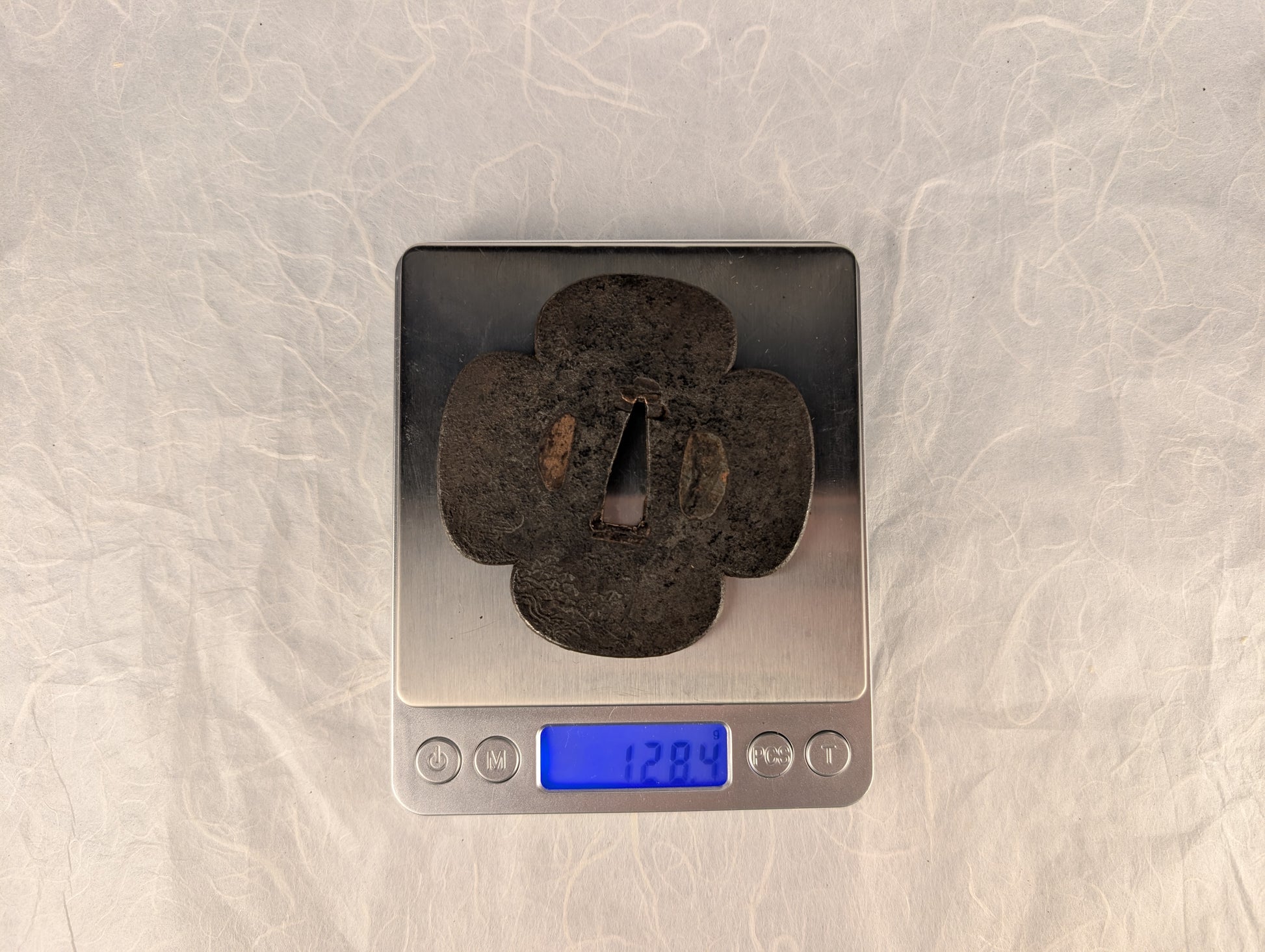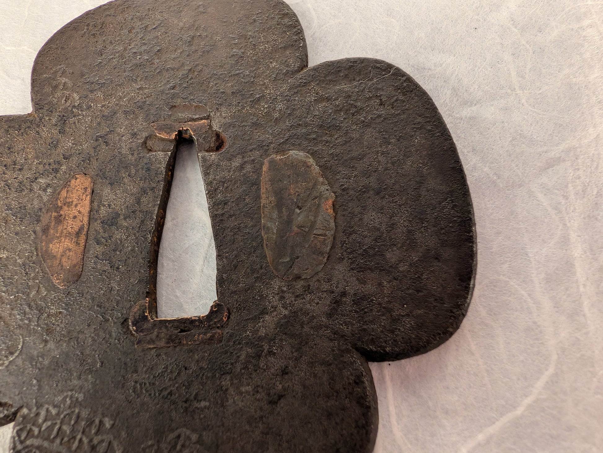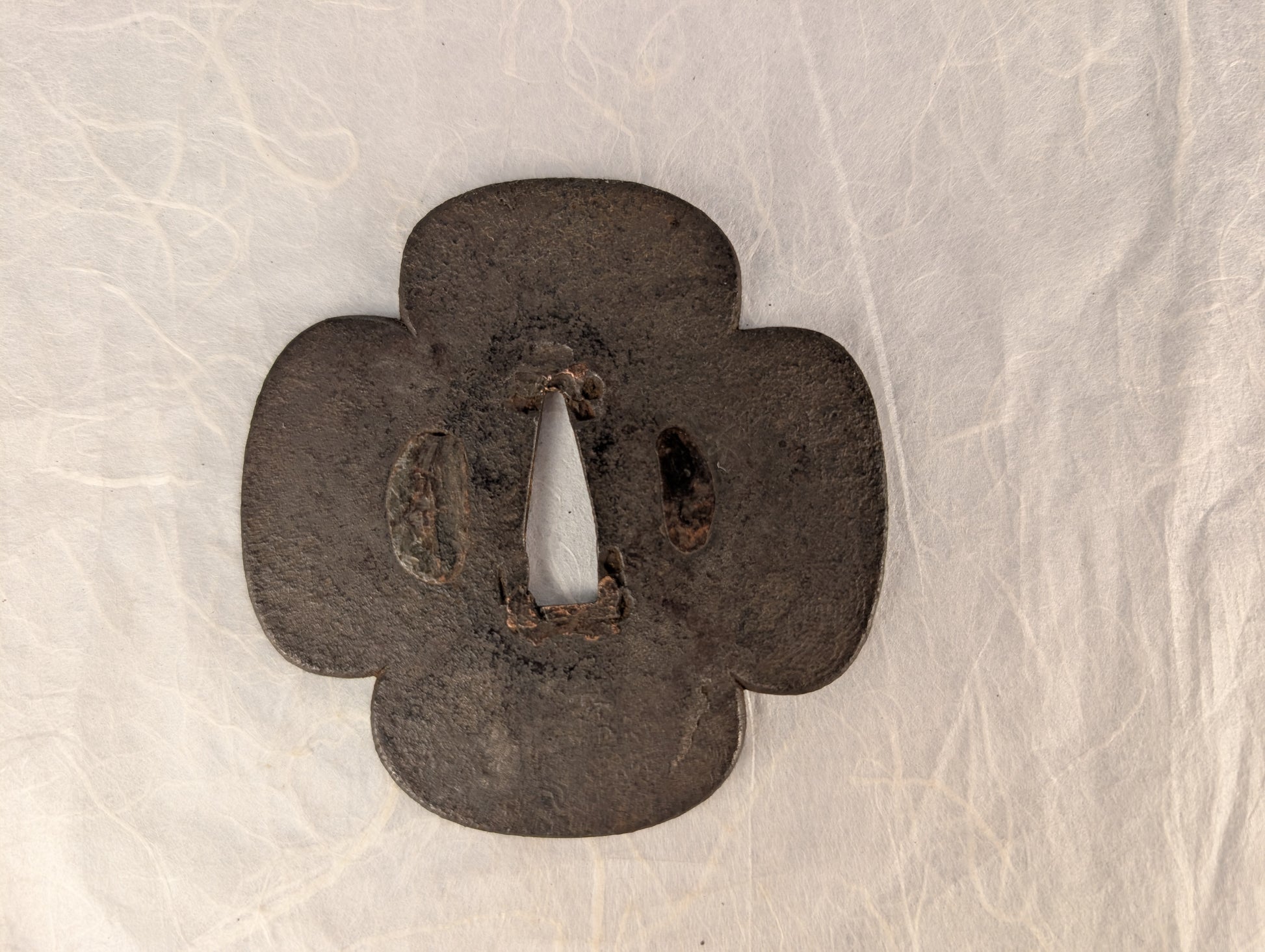This iron tsuba is of mokkō-gata form, with four softly lobed sides creating a balanced clover-like silhouette. The surface exhibits a dark brown to black patina with granular texture, showing extensive age and use. The iron has a matte, dry appearance, with scattered shallow pitting and softened edges consistent with long-term handling and exposure rather than active corrosion. Shakudo plugs fill both hitsu-ana. Along the rim, minor losses and compressions are visible at several points, particularly near one lower lobe, where the iron shows a shallow chip or delamination; this appears stable and does not threaten the overall integrity of the plate.